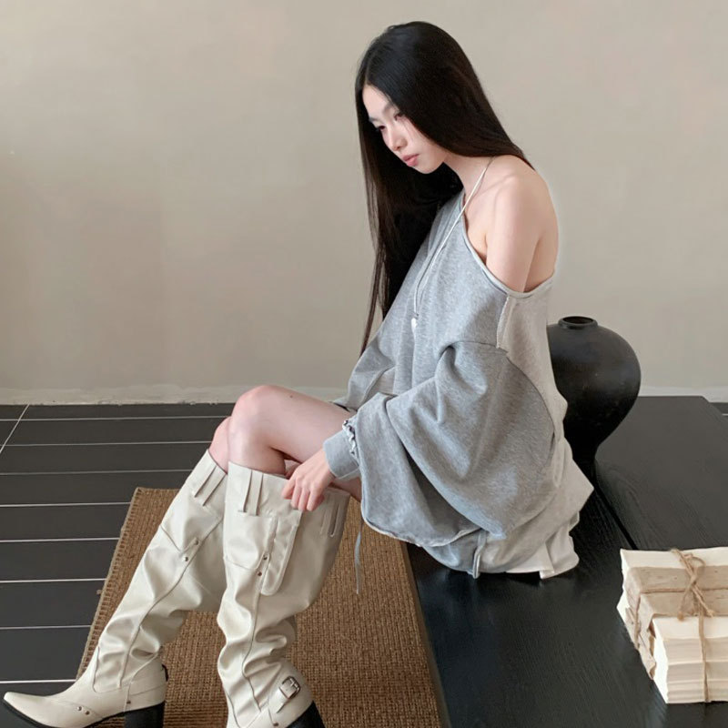 卫衣套装女宽松慵懒斜肩长袖套头拼接外套上衣+短款半身裙两件套