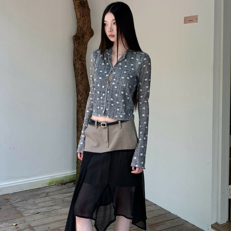 衬衫女印花波点长袖上衣针织开衫+不规则下摆丝质网纱拼接半身裙