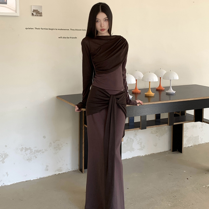 连衣裙女套装针织拼接飘带修身褶皱t恤上衣+绑带包臀长裙半身裙秋