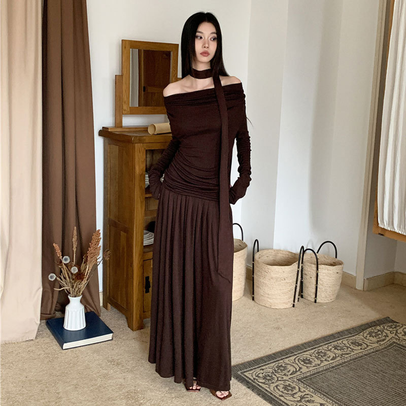 ワンピースの女性のデザイン感の小さい大衆の復古の偽の2つの首の長袖は腰を収めてやせているギャルの長いニットのスカートの秋を現します。