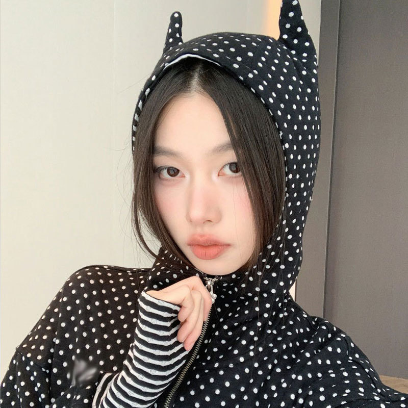 波点套装女设计感小众连帽短款卫衣+高腰翻边长裤修身显瘦两件套