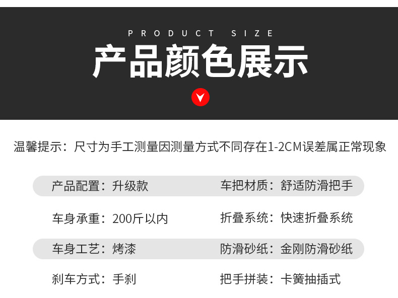 颜色 辐条轮短把白色,辐条轮短把粉色,辐条轮短把黑色,辐条轮短把红色,辐条轮短把卡其色,辐条轮短把绿色,一体轮短把白色,一体轮短把粉色,一体轮短把黑色,一体轮短把红色,一体轮短把卡其色,一体轮短把绿色,一体轮长把白色,一体轮长把粉色,一体轮长把黑色,一体轮长把红色,一体轮长把卡其色,一体轮长把绿色