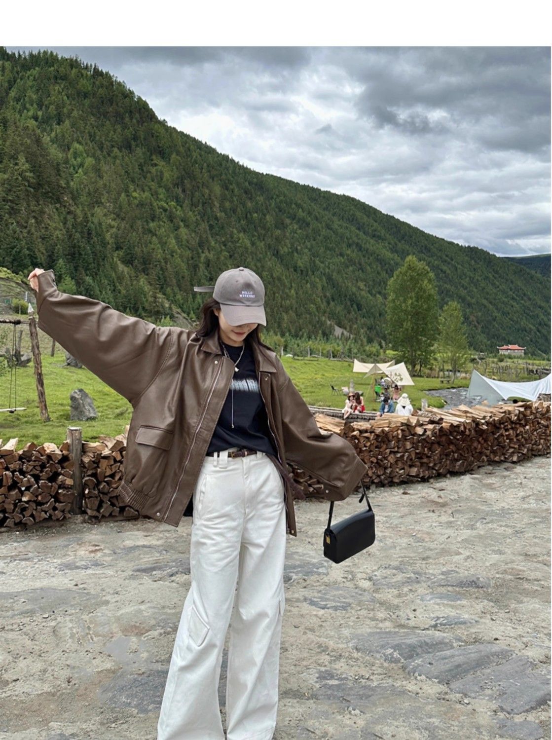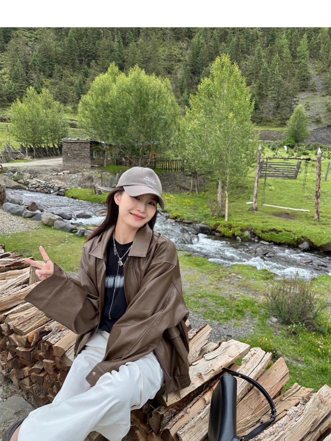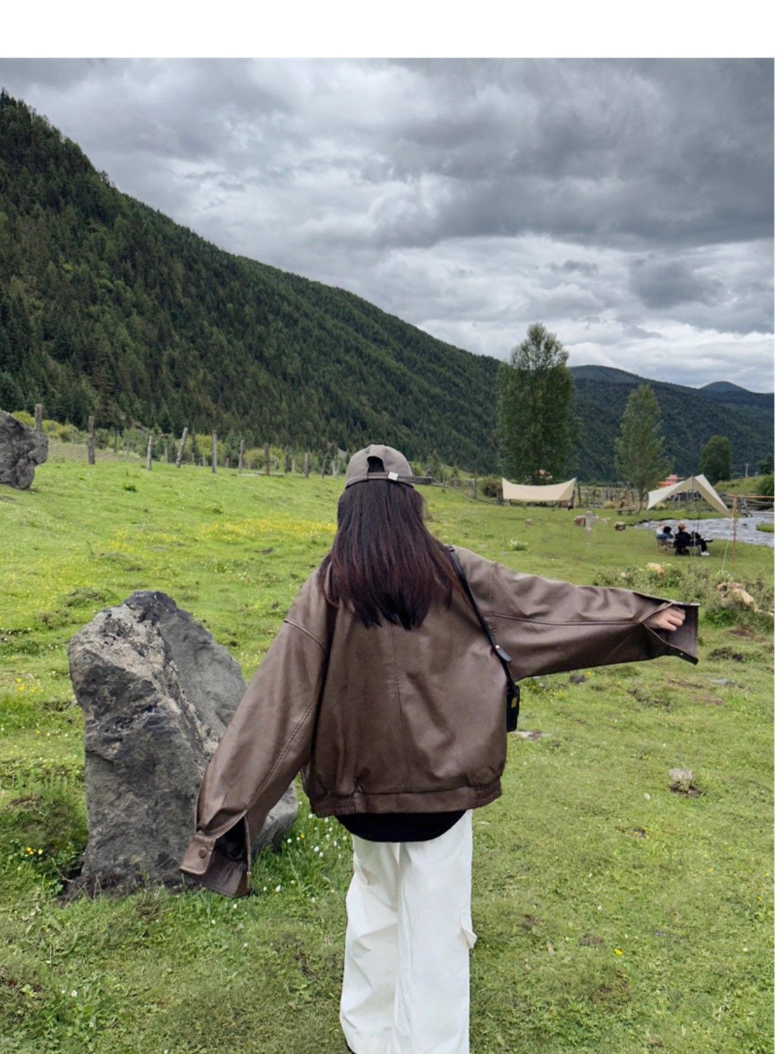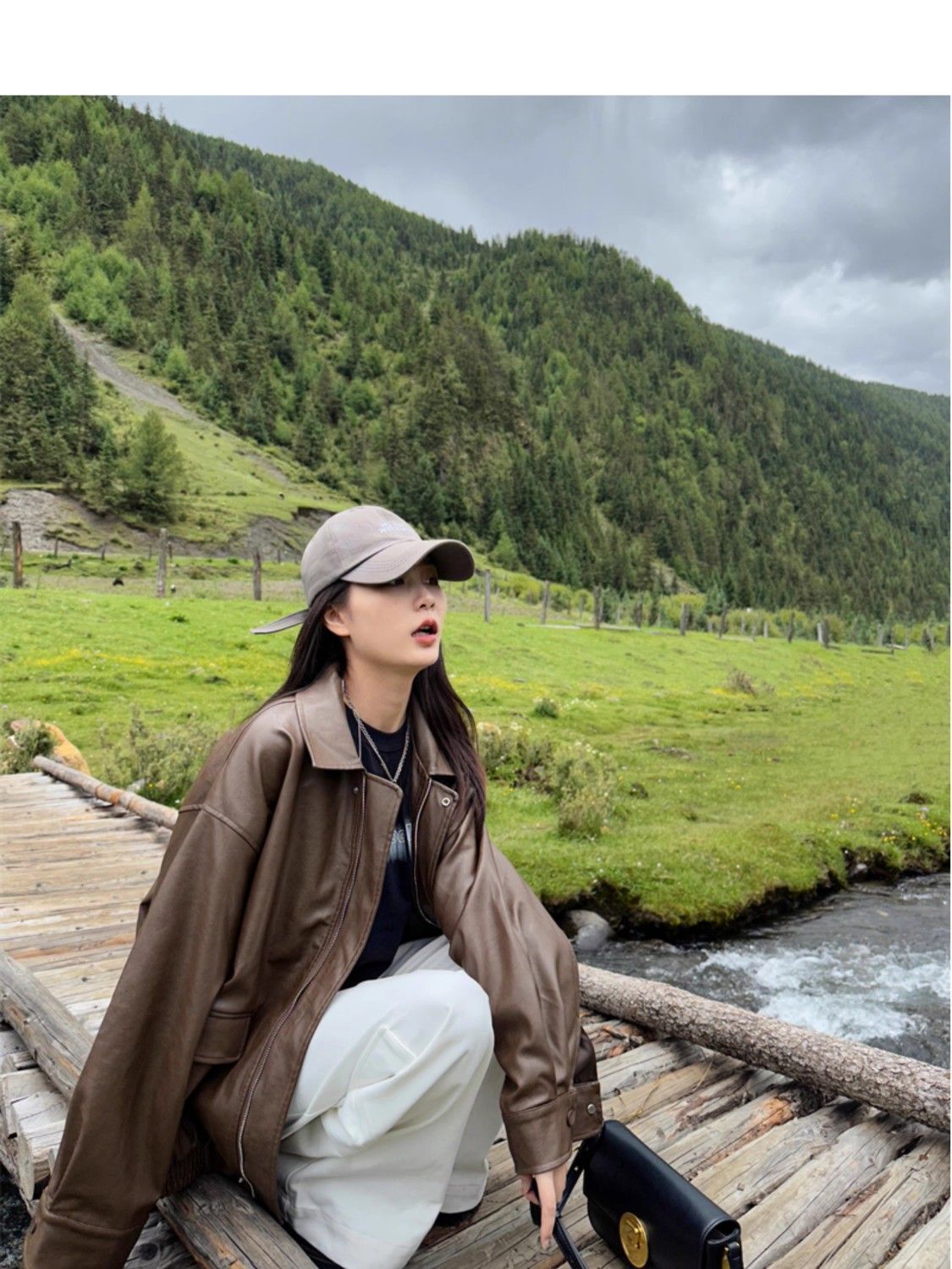 アメリカンブラウンレトロダメージ加工ルーズレザージャケット女性のための春と秋2025新しいルーズ韓国スタイル暖かいジャケットトレンディ