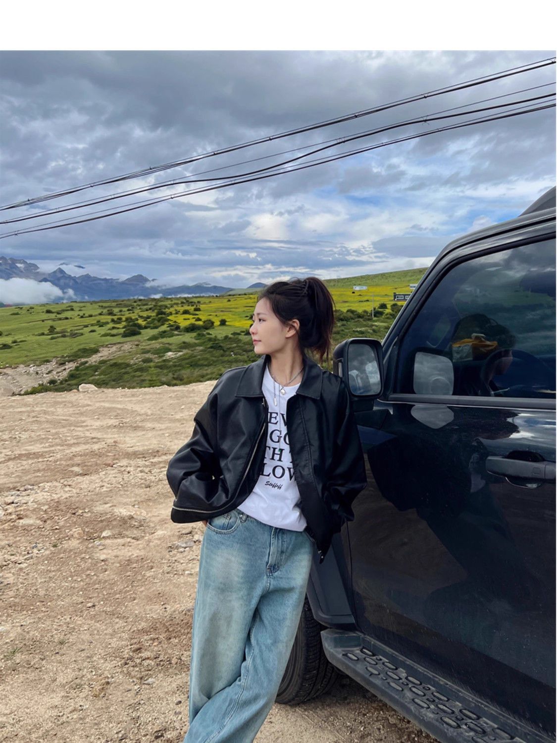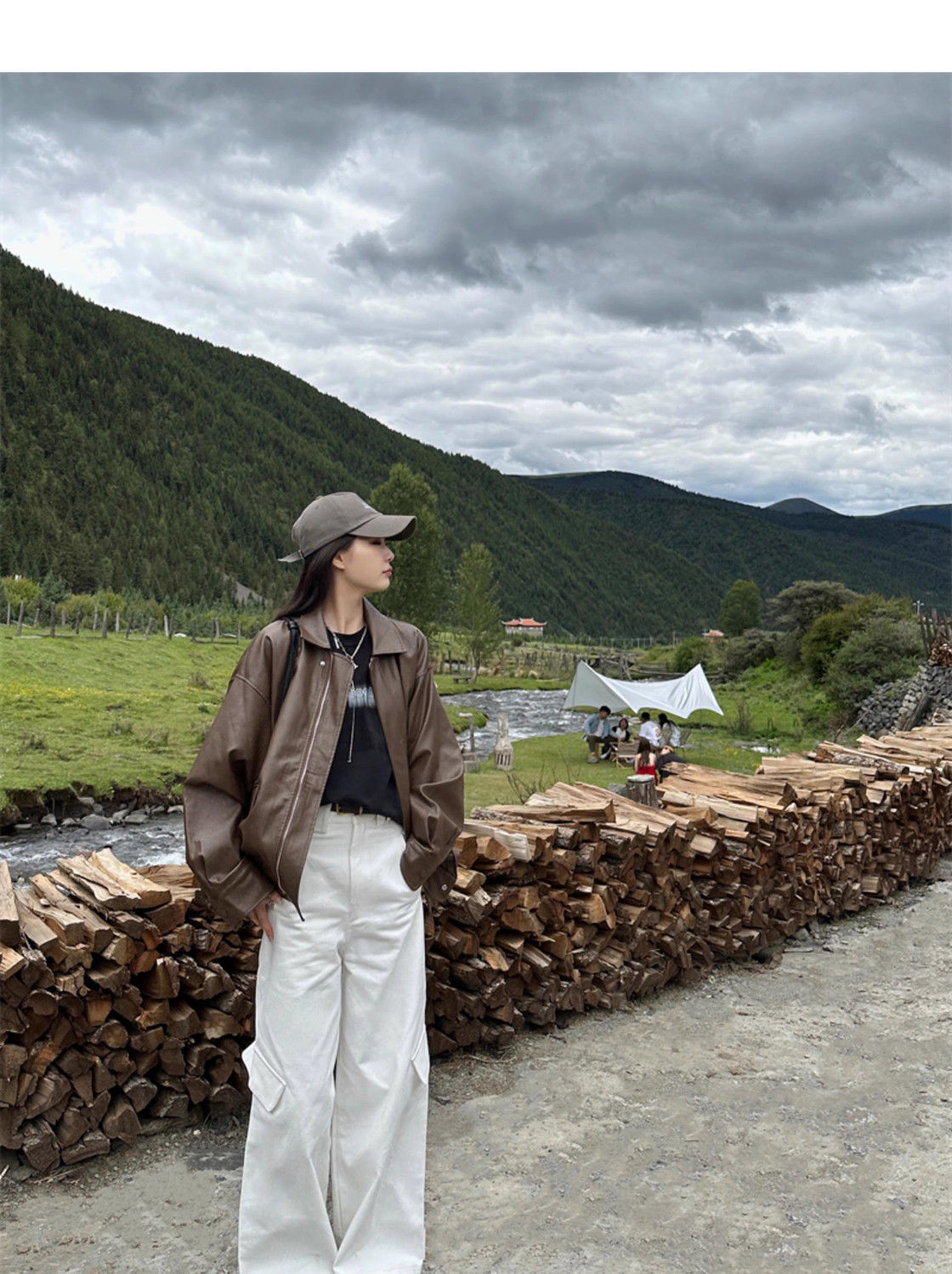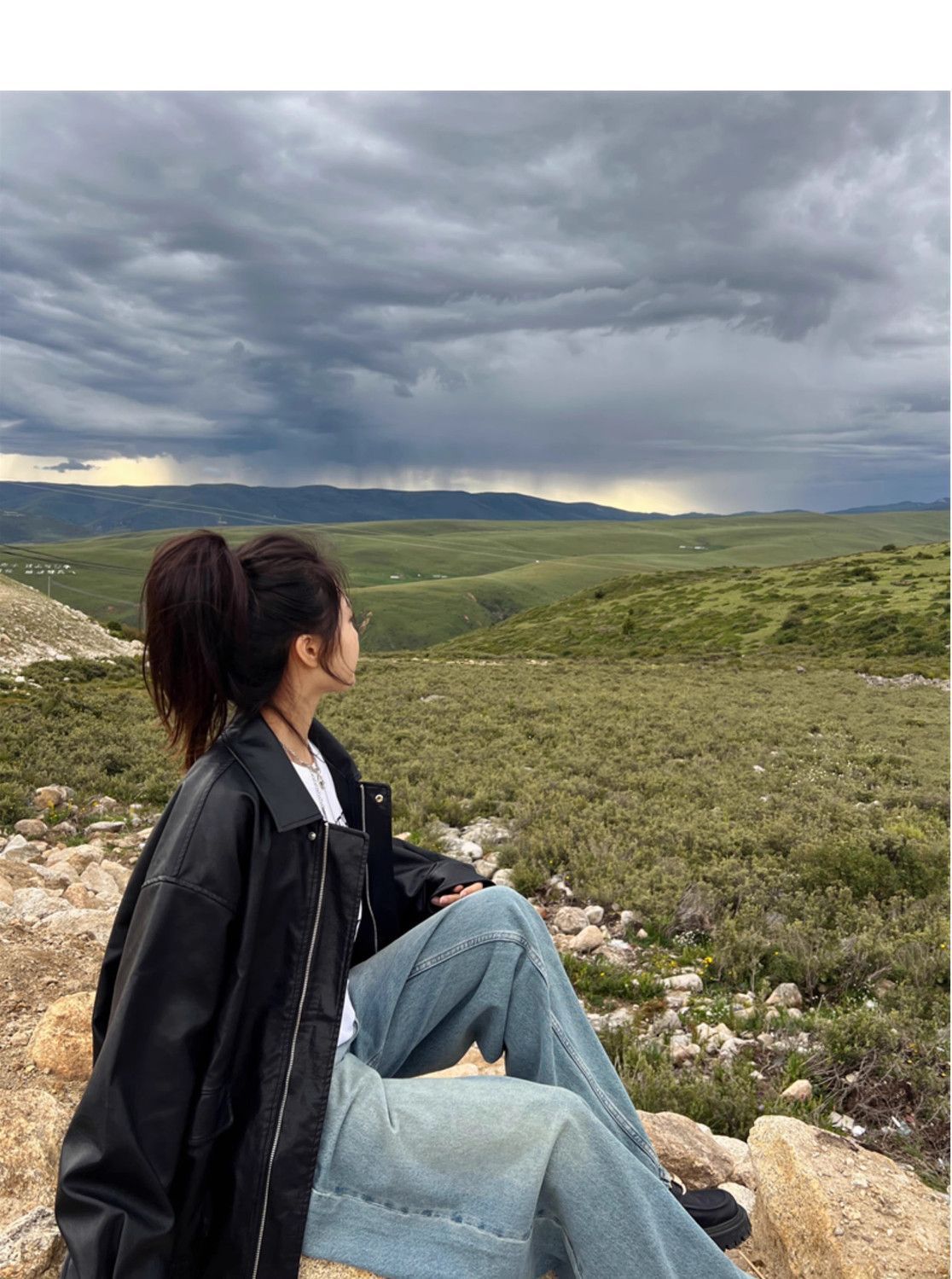 アメリカンブラウンレトロダメージ加工ルーズレザージャケット女性のための春と秋2025新しいルーズ韓国スタイル暖かいジャケットトレンディ