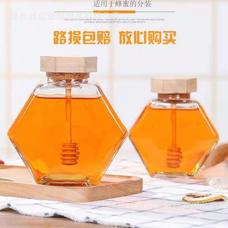 透明玻璃蜂蜜瓶带搅拌棒带盖六棱加厚酱菜瓶果酱瓶密封储物罐批发