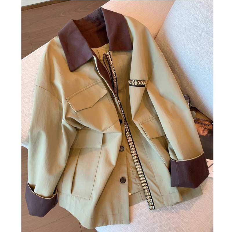撞色钉钻中长款风衣女2025秋冬季新款高级感宽松休闲夹克外套批发