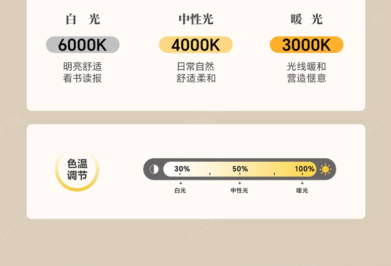 灯光颜色 三色变光【全光谱护眼】,无极调光-支持天猫【全光谱护眼】,无极调光-支持小爱同学控制【全光谱护眼】