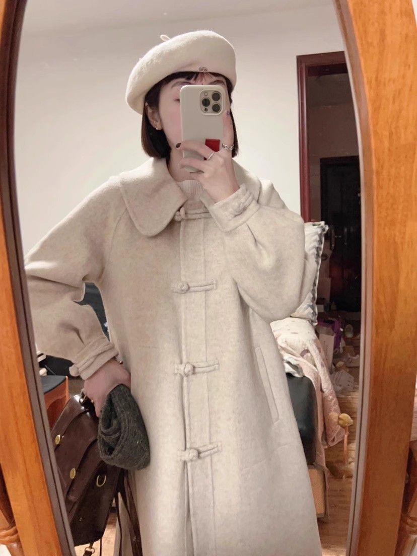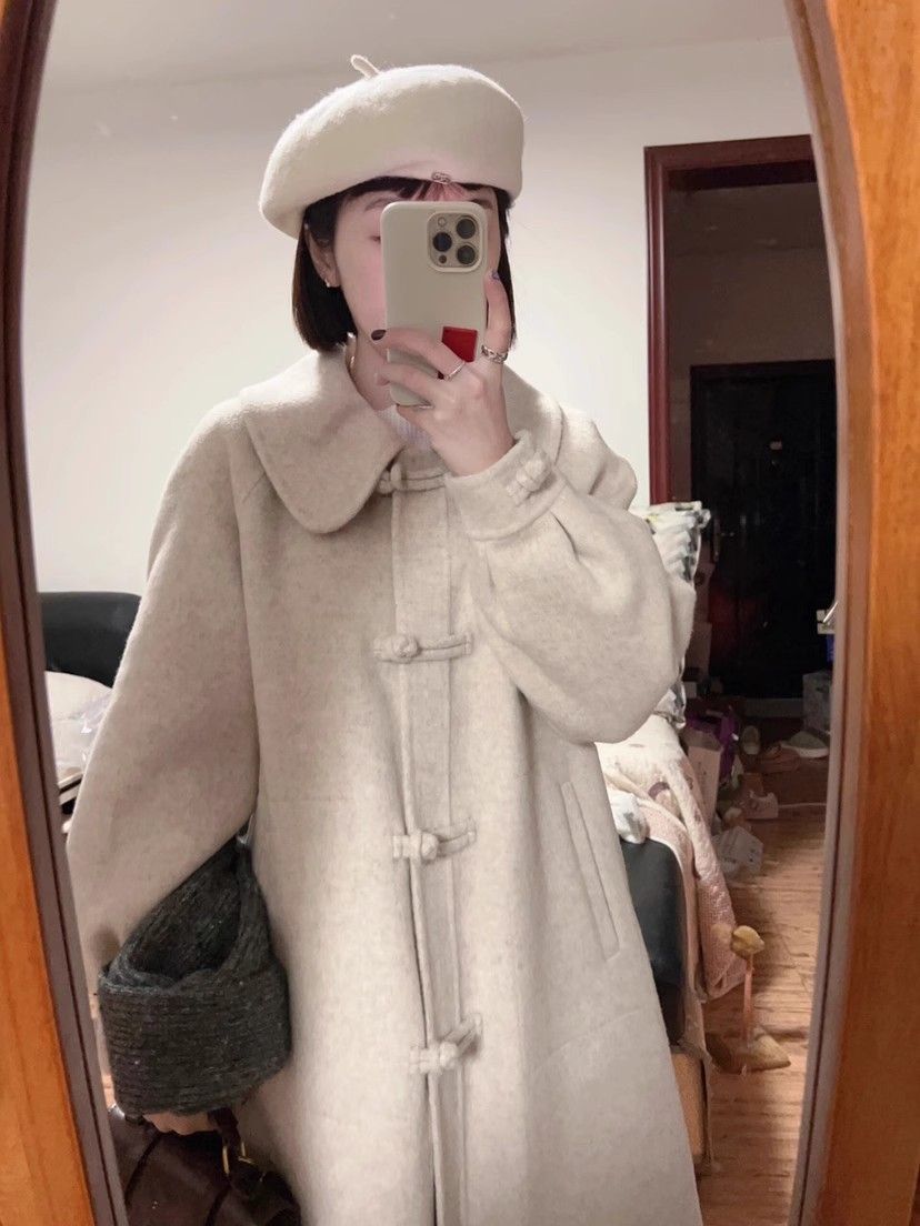 オートミールカラーカレッジスタイルコートミドル丈2025秋冬ベビーカラー冬ヘップバーン優しい小柄ウールコート