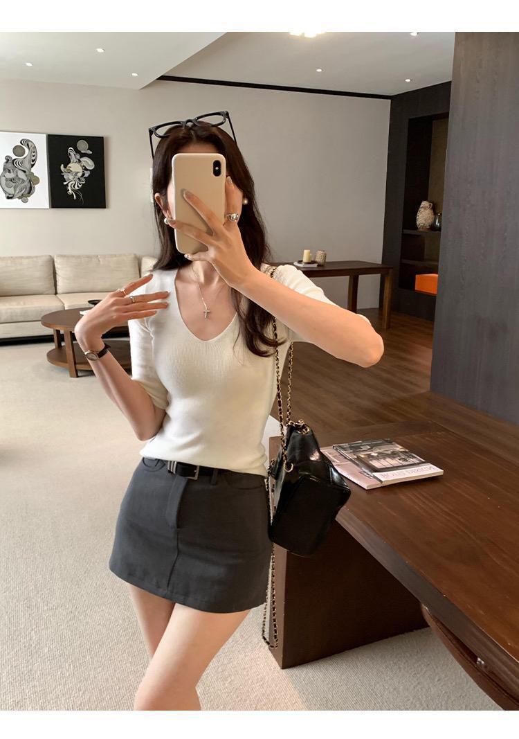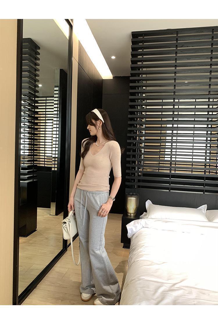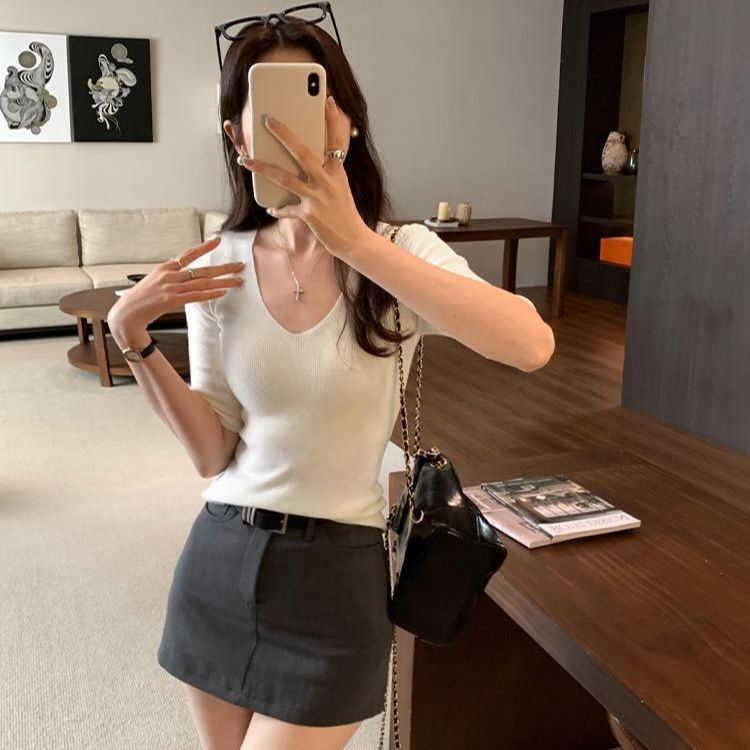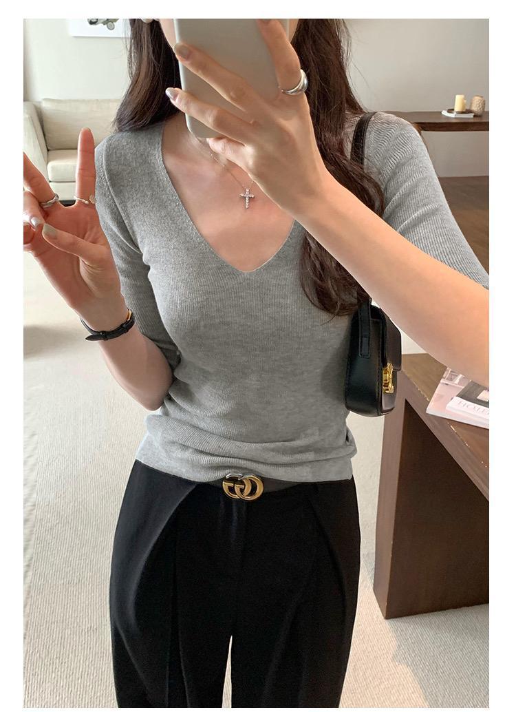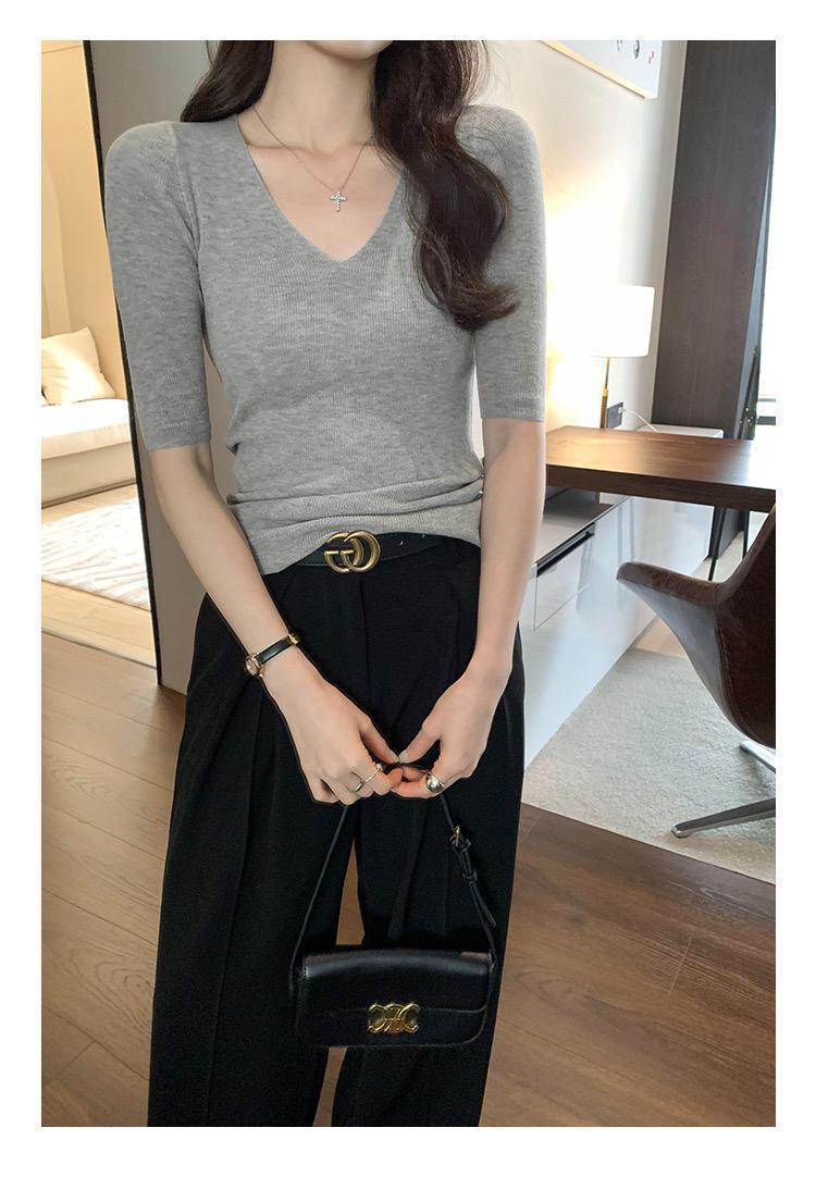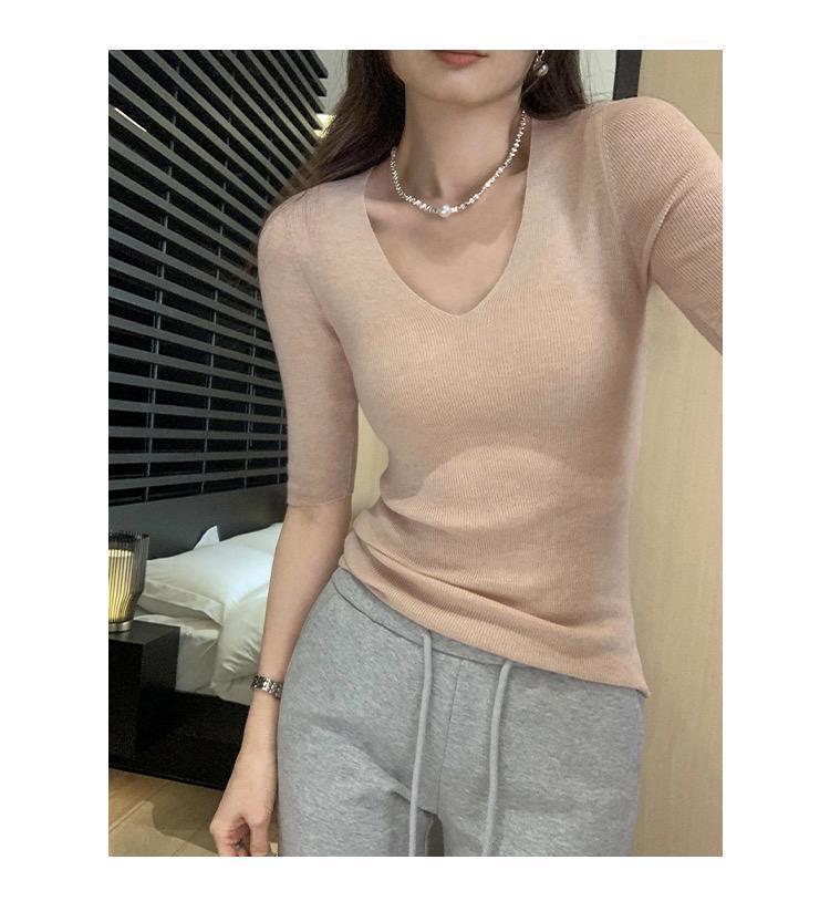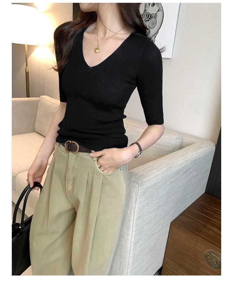 超美しく、優しく、ユニークな気質の女性用Vネックスリムミッドスリーブセーター2025夏インナーレイヤリングトップ