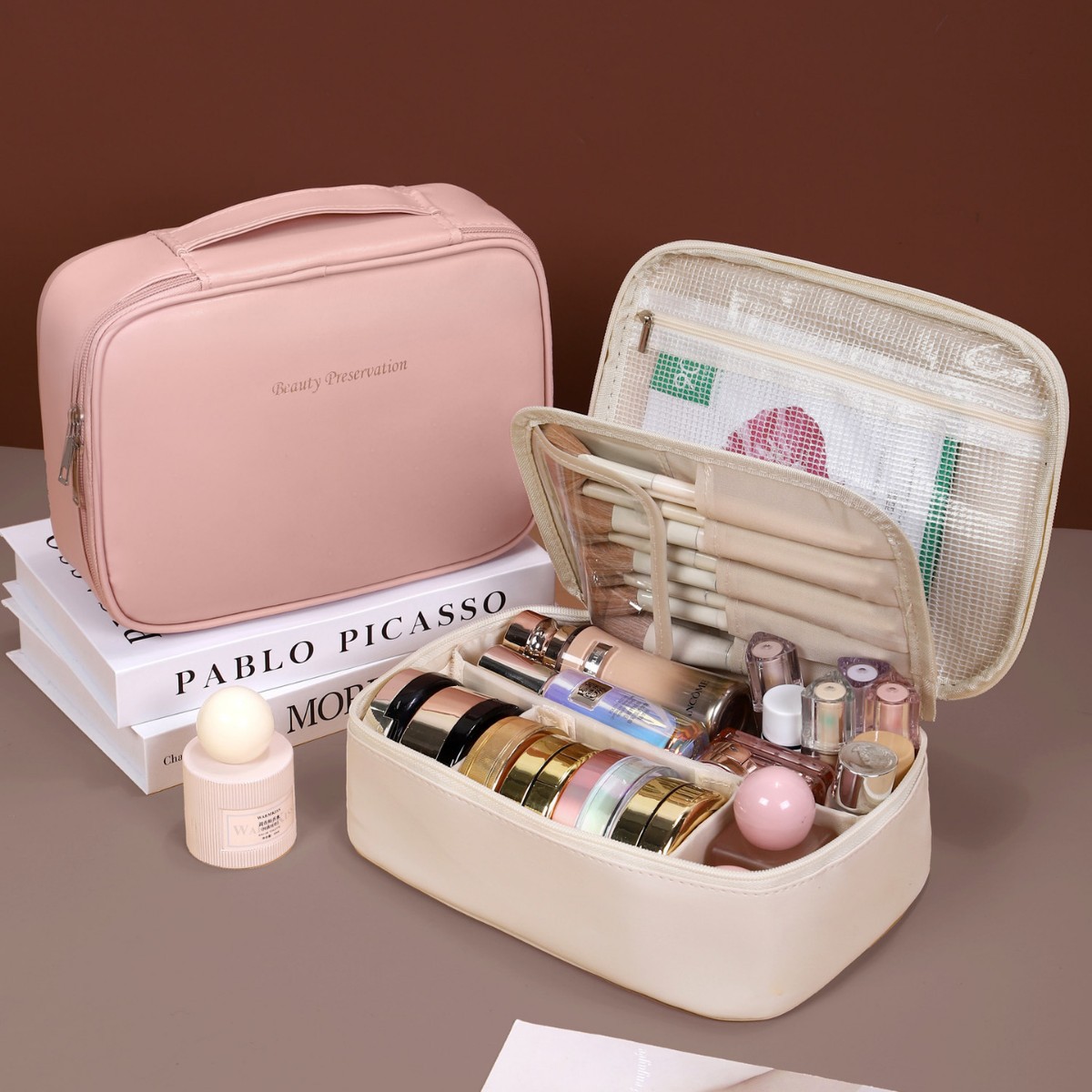 国境を越えた革の防水化粧品バッグ、分割層状の立体的な大容量の収納バッグ、ポータブルトイレタリーバッグ、最小ロット