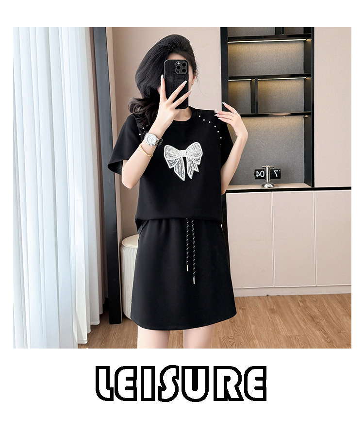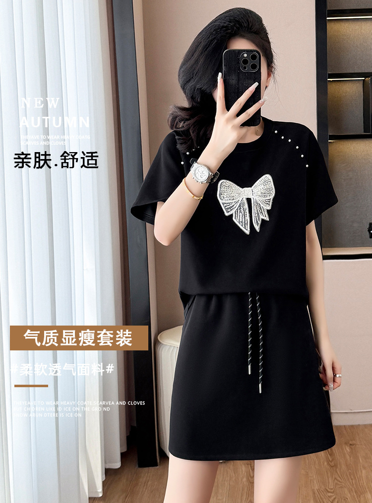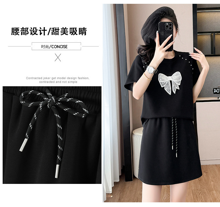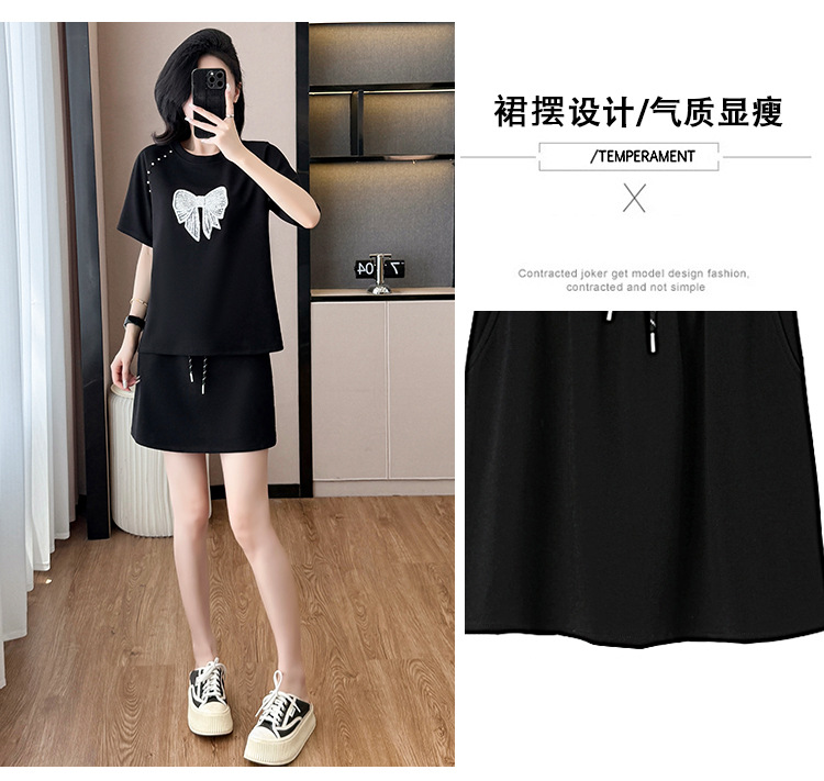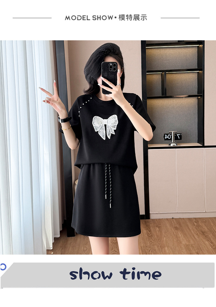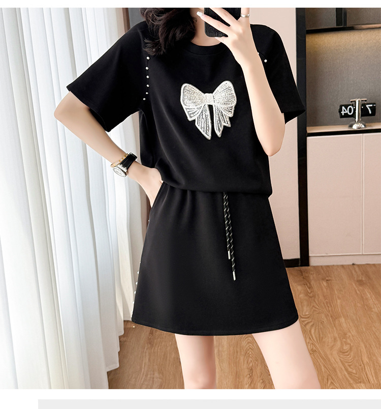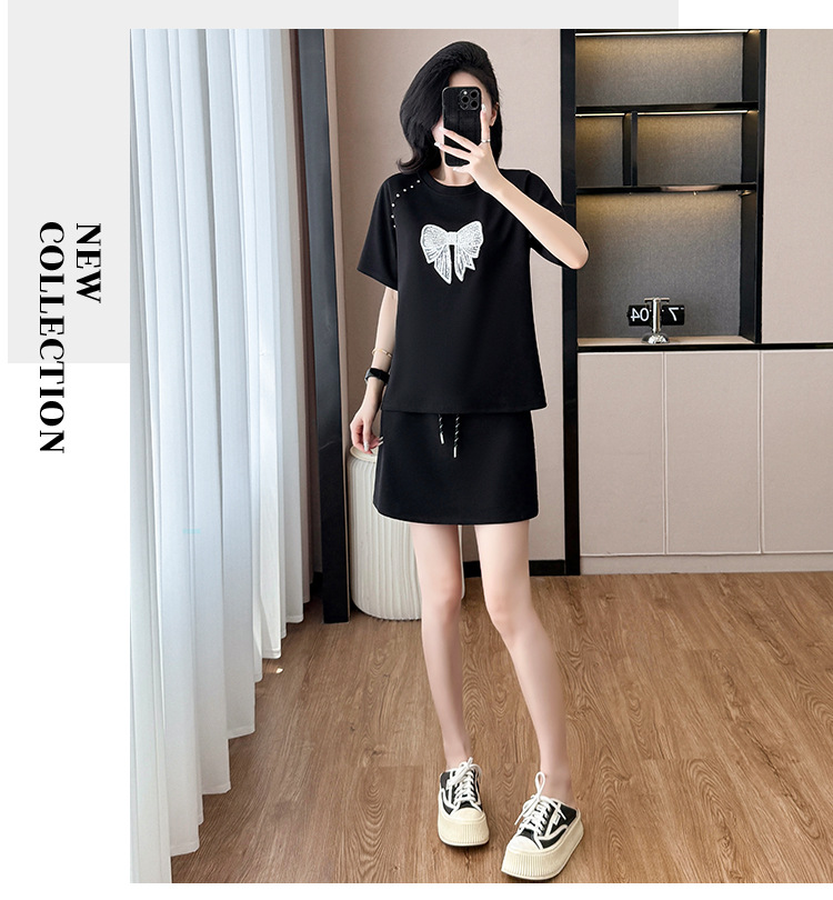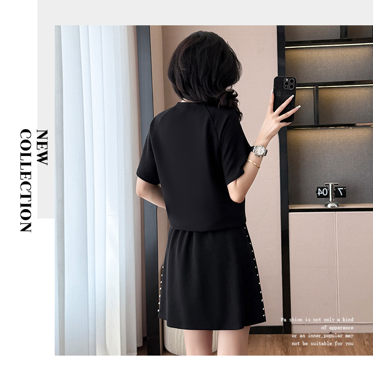 hymwl9914 重工業ビーズルーズスーツ女性の 2025 夏スポーツカジュアル Tシャツ黒ショートスカート 2 点セット