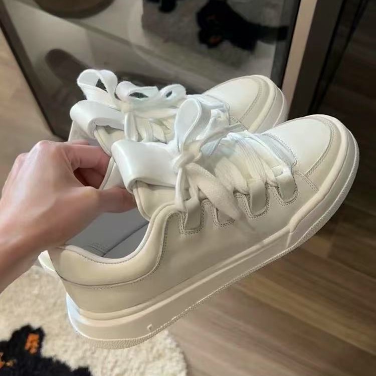 Amiuと同じスタイル〜牛革厚底カジュアルレディースシューズ2025春夏新作万能ラウンドトゥレースアップ白靴女性用