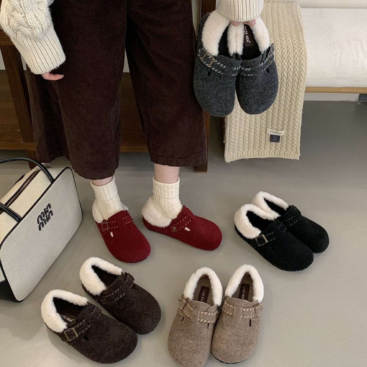 复古编织厚底包头半拖鞋女2025秋冬新款外穿一脚蹬搭扣勃肯棉鞋