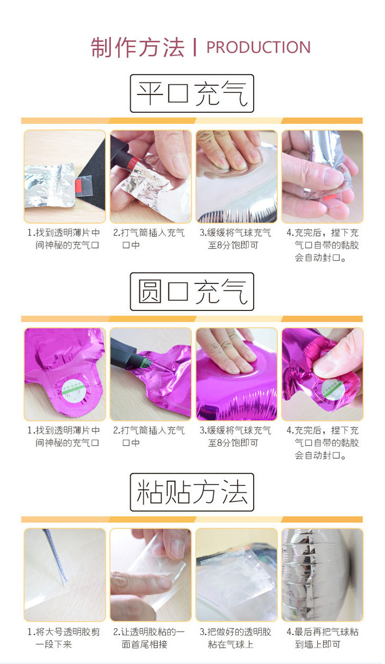 [产品说明]铝箔气球是自动封口的,打完气后自动封口,充气时必须注意气仓顺畅!打气慢!气量小!充气后保持足够的弹性!它是铝膜气球,不是铝气球,材料完全没有弹性,需要特别小心。