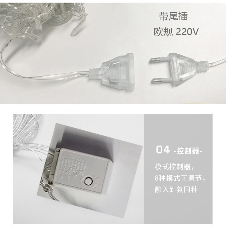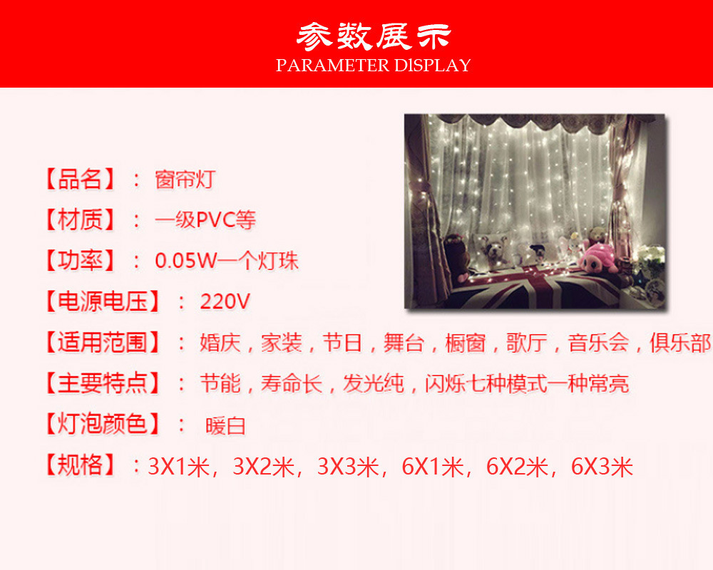颜色 3米*1米-120灯【插电款-八公能带尾插】,3米*2米-240灯【插电款-八公能带尾插】,3米*3米-300灯【插电款-八公能带尾插】,3米*1米-128灯【太阳能款-USB充电带遥控器】,3米*2米-180灯【太阳能款-USB充电带遥控器】,3米*3米-304灯【太阳能款-USB充电带遥控器】