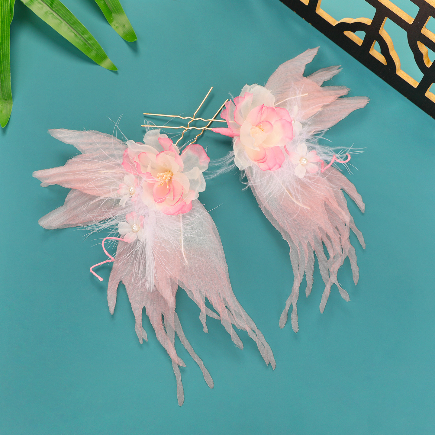 新款原创设计粉色凤尾蝶烫花发夹手工制作妆造拍摄马面裙汉服头饰