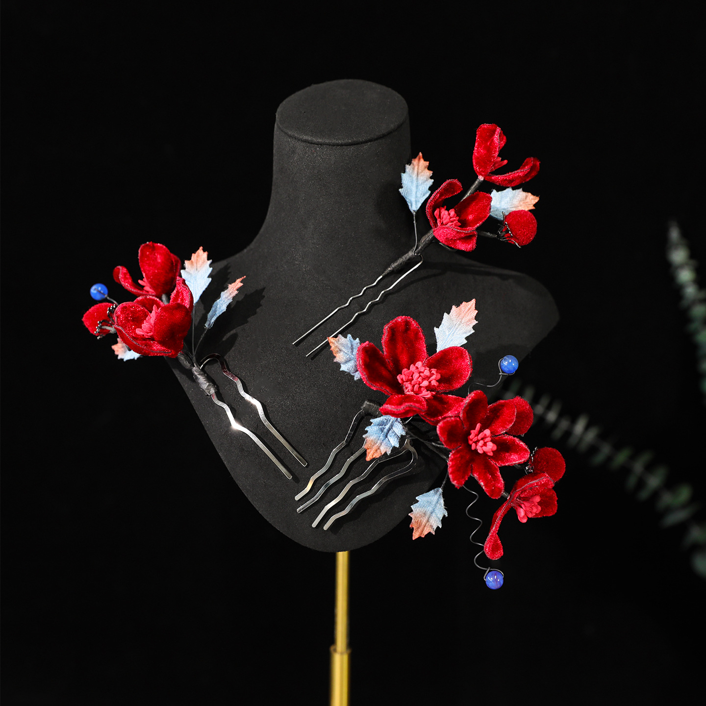 2025新款秋冬古风新中式头饰小众红色绒布花妆造发钗套装汉服发饰