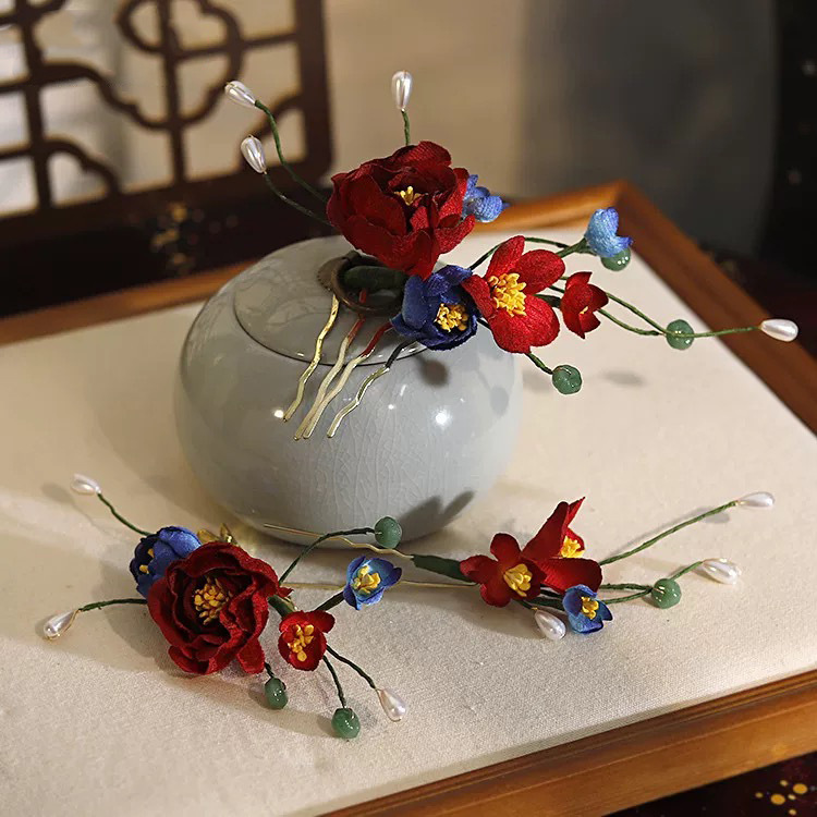 オリジナルデザインのツバキの花の髪飾りショーイネの服のチャイナドレスのスタイルの髪飾りの赤い青い色の馬のスカートの漢服の頭