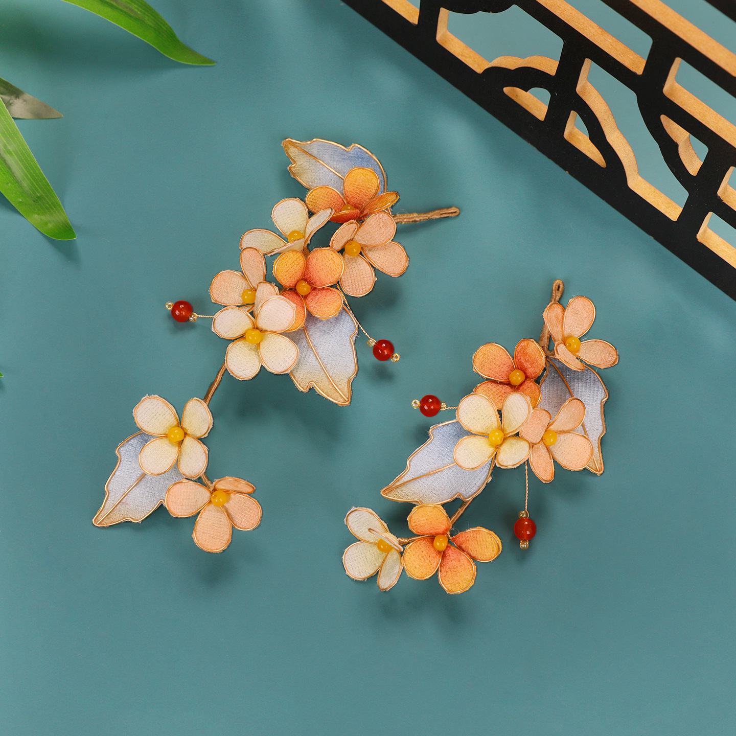 オリジナルデザイン、手作り、アンティークスタイル、グラデーションオレンジ模造ベルベットフラワークラフト、ソフトヘアピン、メイクアップアクセサリー、漢服頭飾り