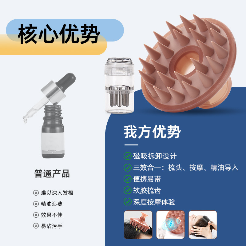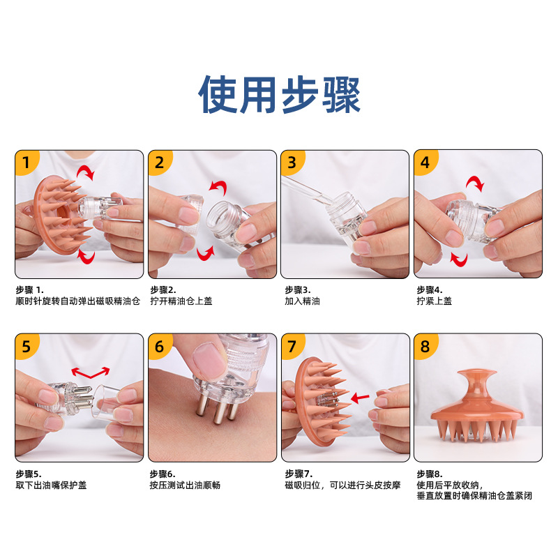 功能用途特点:头皮清洁.洗头按摩.刺激经络.促进血液循环.缓解疲劳. 可装液出液,头皮上药.上精油.