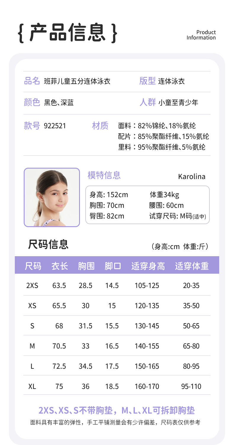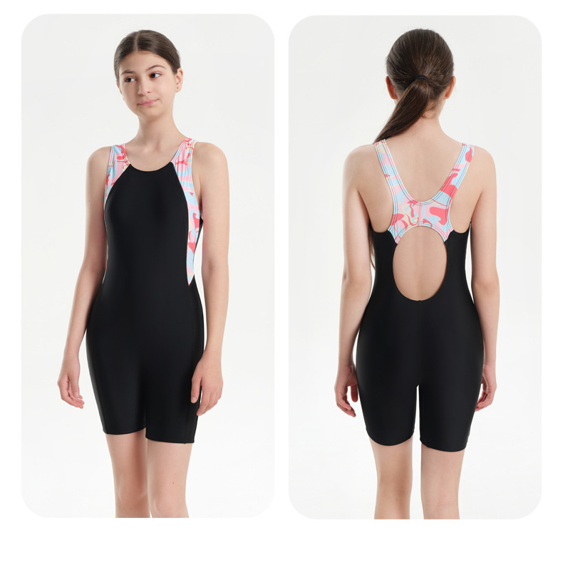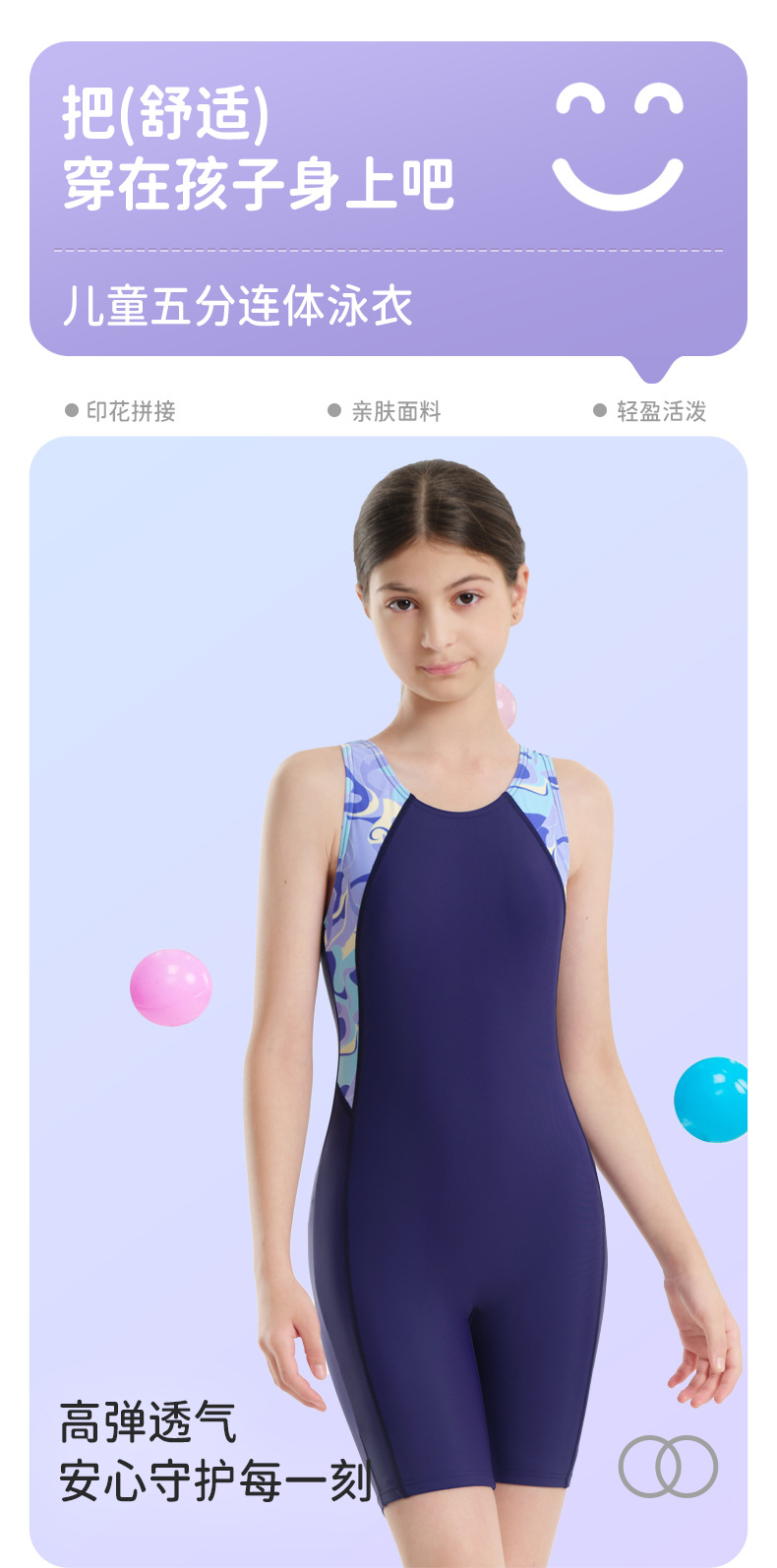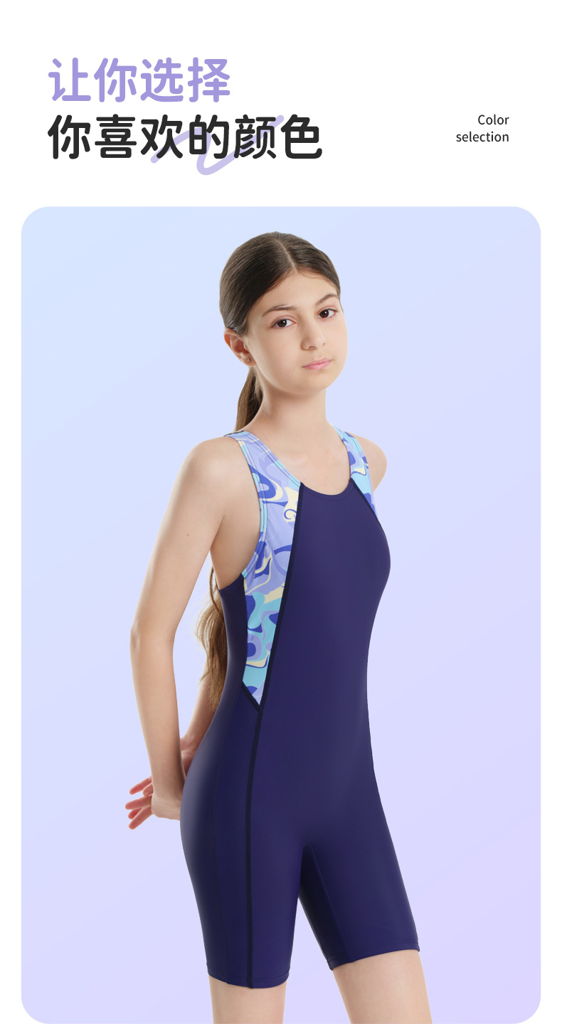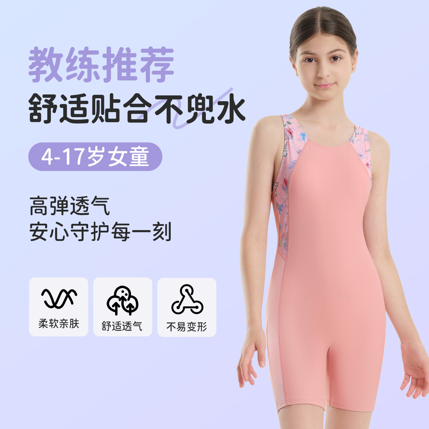 班菲儿童泳衣女孩中大童专业训练连体五分泳装游泳竞技大码有胸垫