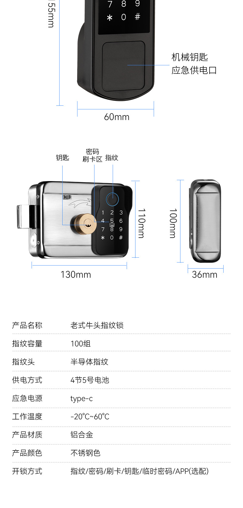 指纹锁免布线牛头锁密码锁遥控锁出租房老式门锁指纹锁智能一体锁