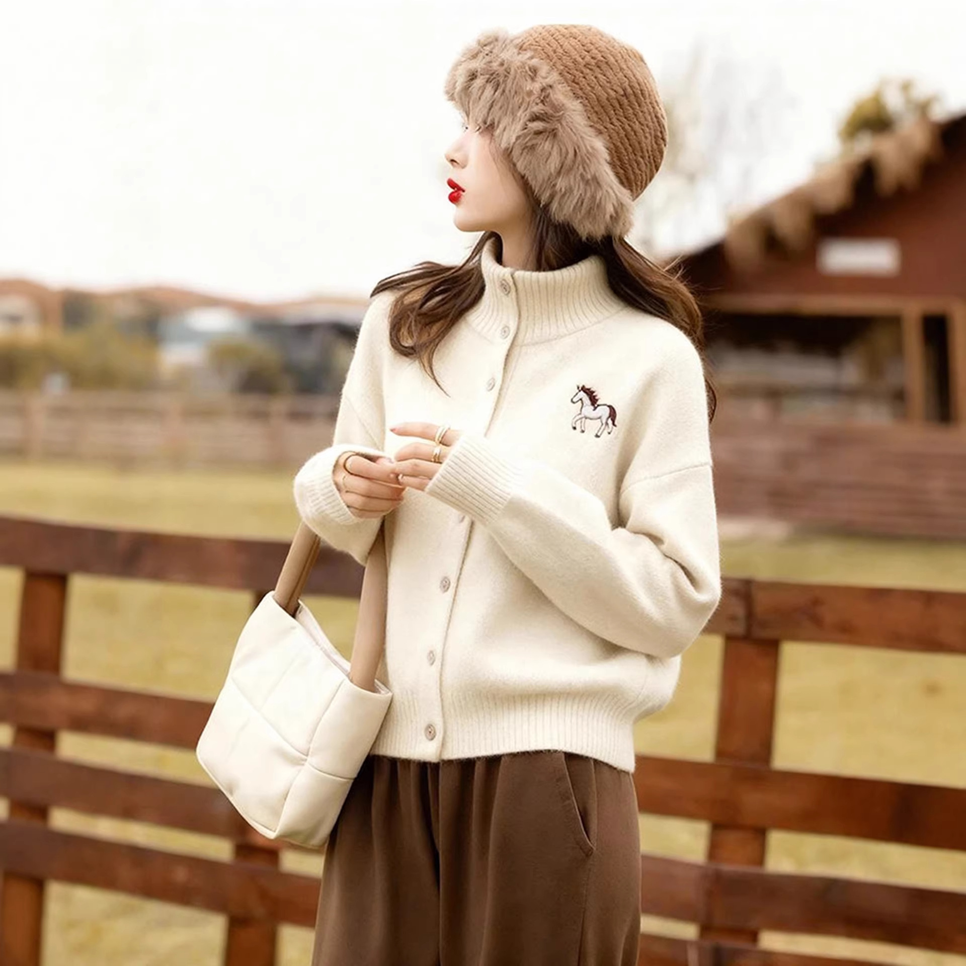 白色小马高领毛衣开衫女秋冬款慵懒风宽松高级感日常通勤针织外套