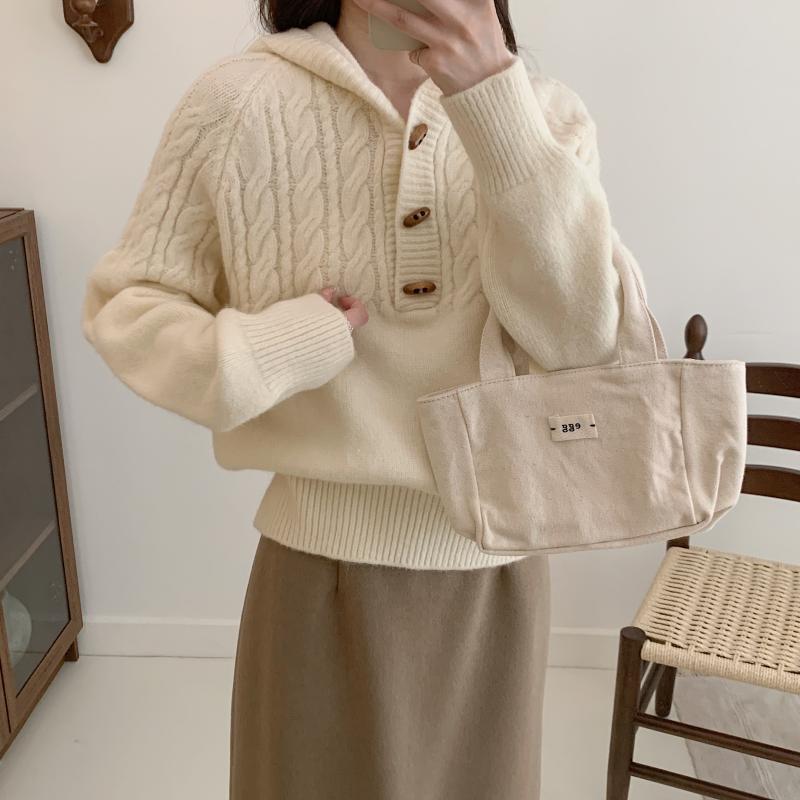 ホーンボタンフード付きツイストセーター女性のための秋と冬の 2025 新しい韓国レトロ気質怠惰なスタイルのセータートップ
