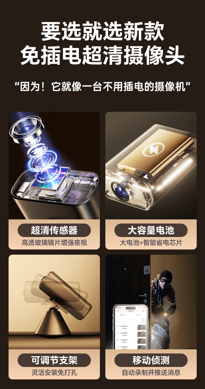 プライベートモデル100W高画質監視カメラ、電源不要、家庭用ワイヤレスWiFi直接接続、携帯電話遠隔操作カメラ