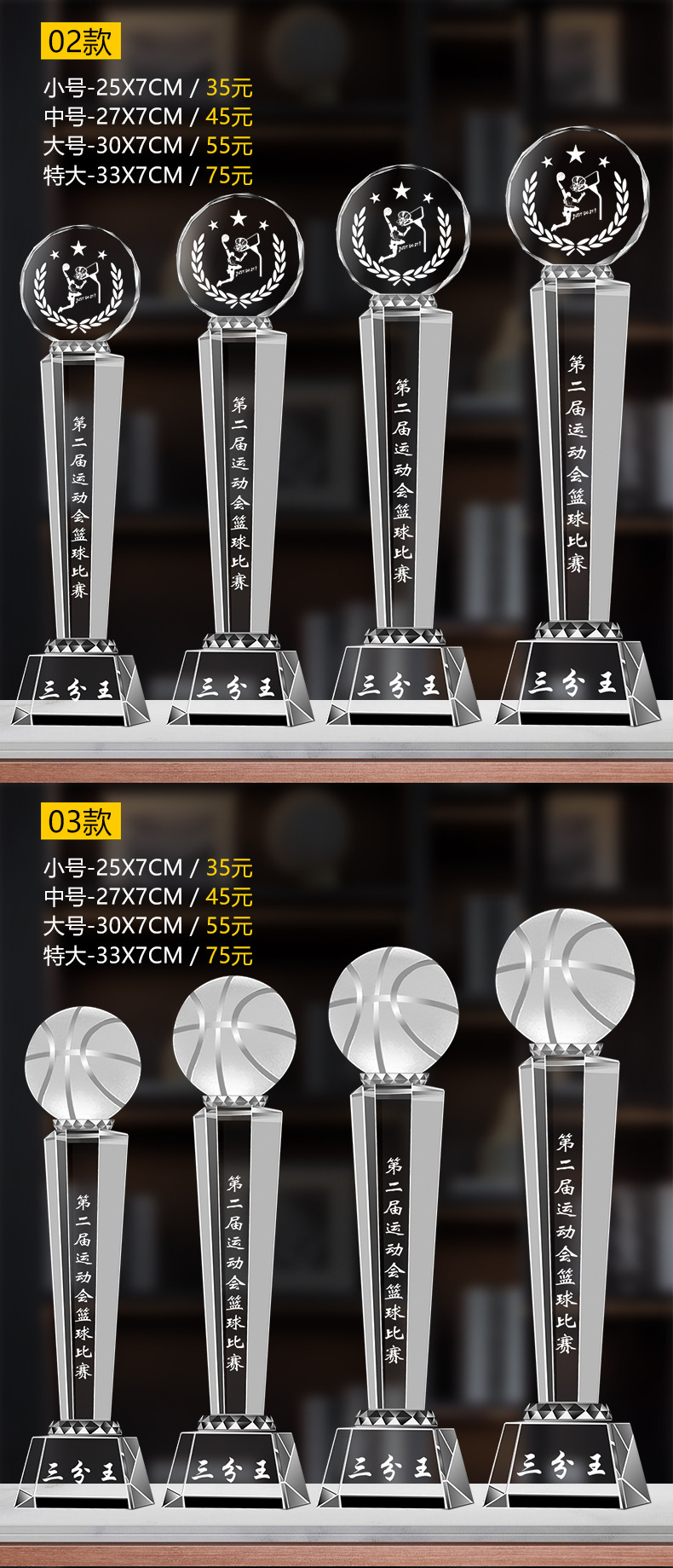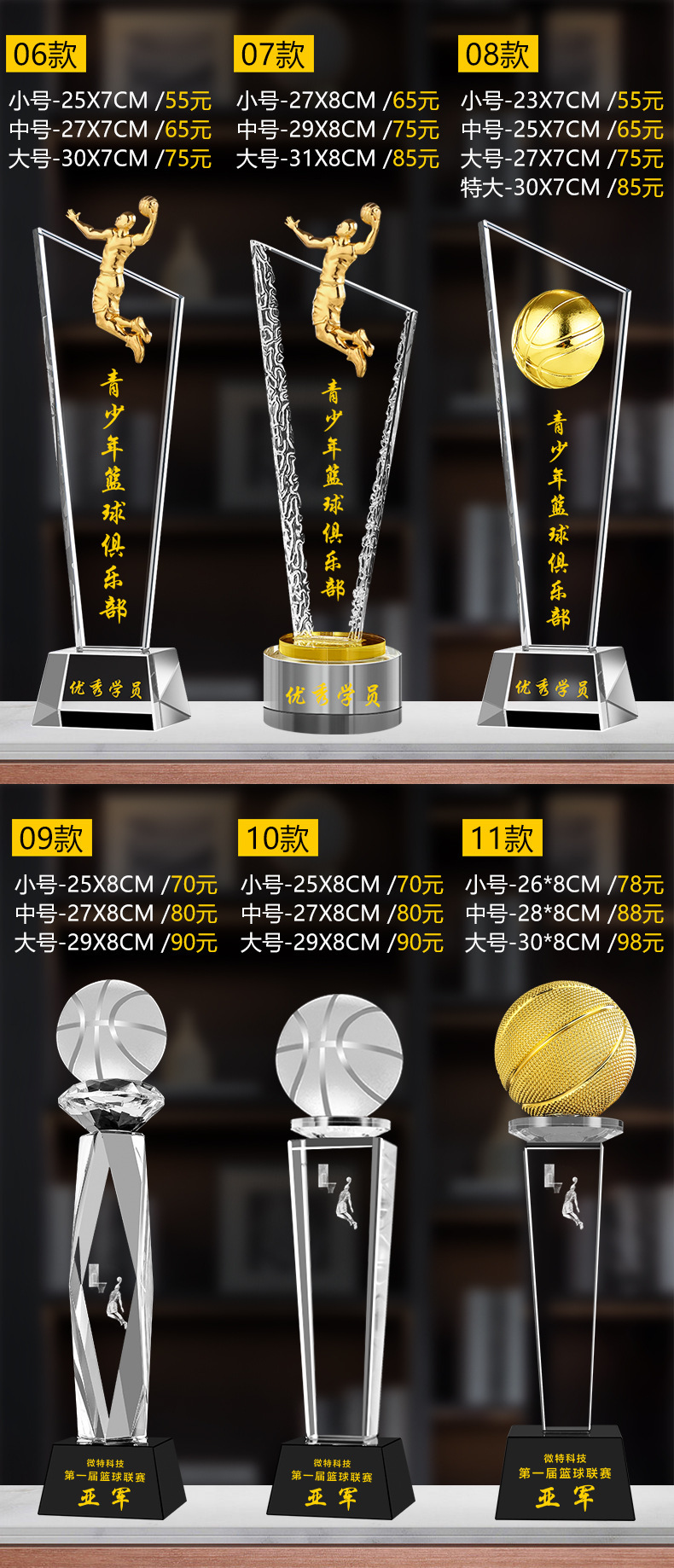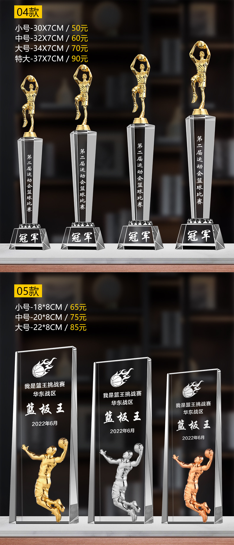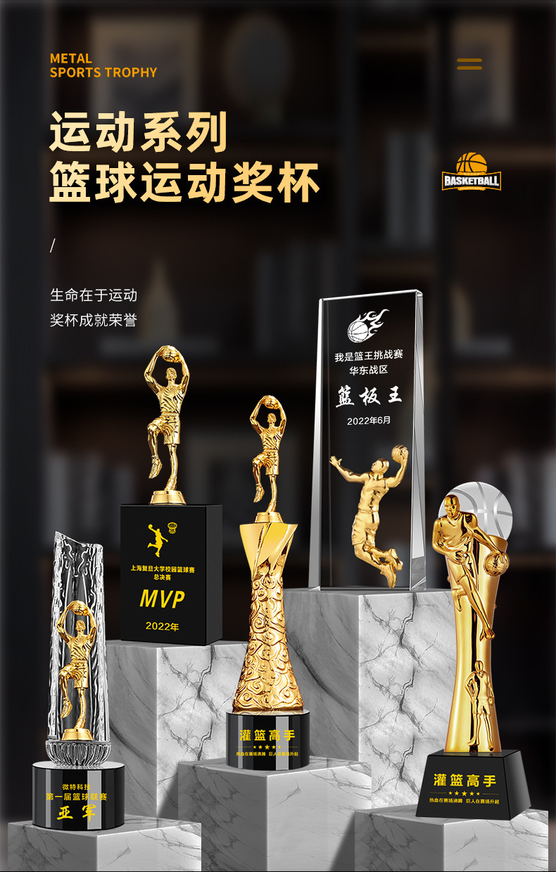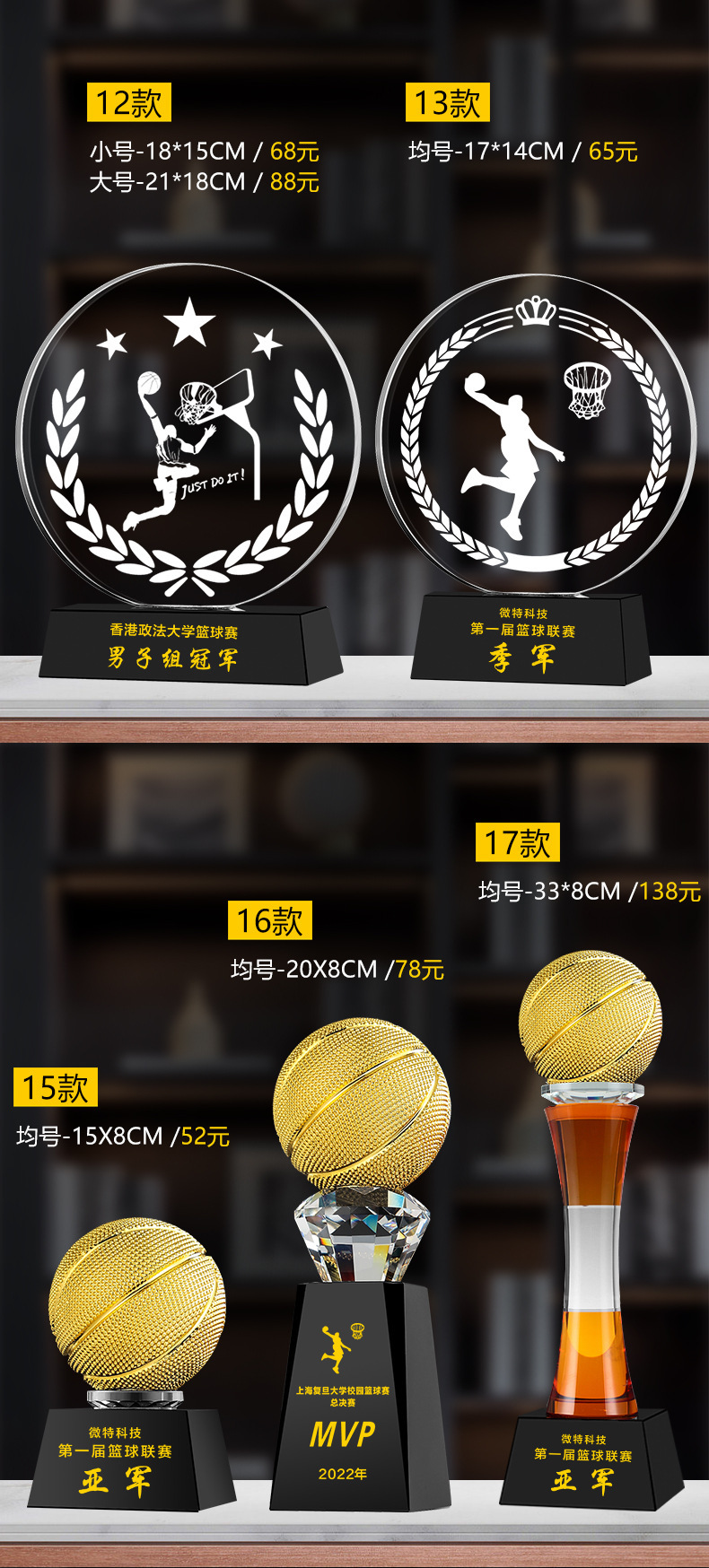 バスケットボールゲームクリスタルトロフィー彫刻サッカーピンポンバドミントンイベント金、銀、銅メダル製造工場