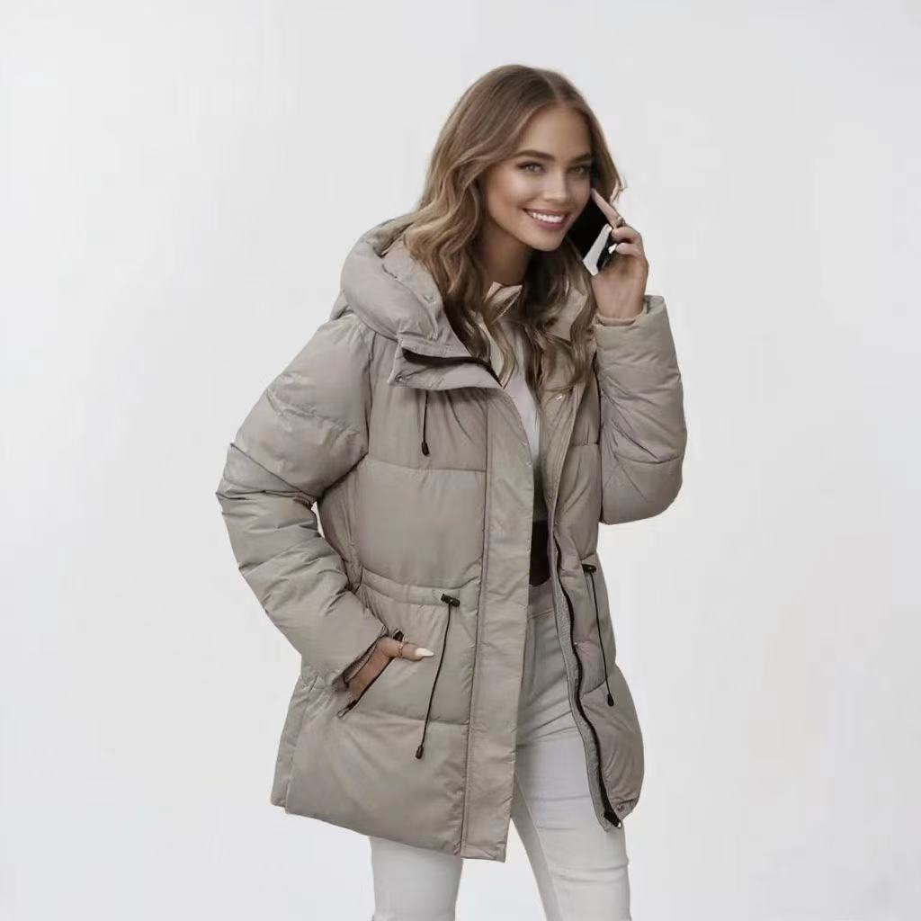 パンコート風ダウンコットンジャケット、婦人用冬用コート、ミドル丈厚手コットンジャケット、2025年新作トレンドフード付き婦人服
