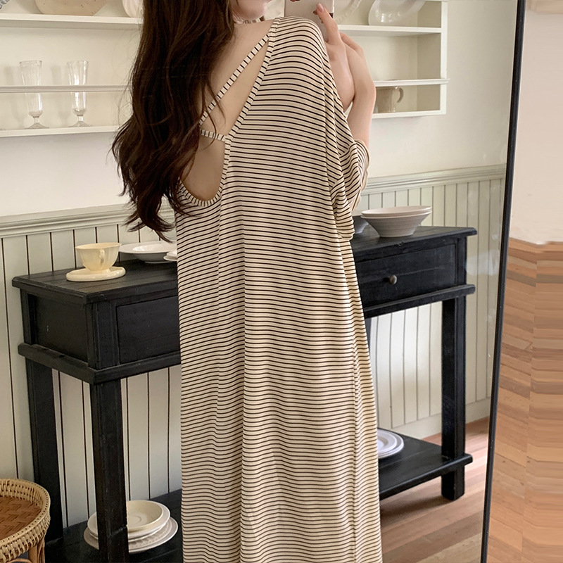 莫代尔中长睡裙夏天女士露背条纹短袖连衣裙简约时尚带胸垫家居服