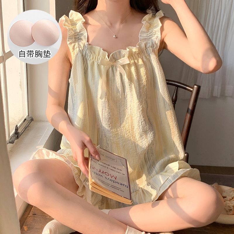 2025年新型パジャマ女性夏胸パッド付きゆるいかわいいノースリーブショートパンツセット家庭服メーカー卸売り