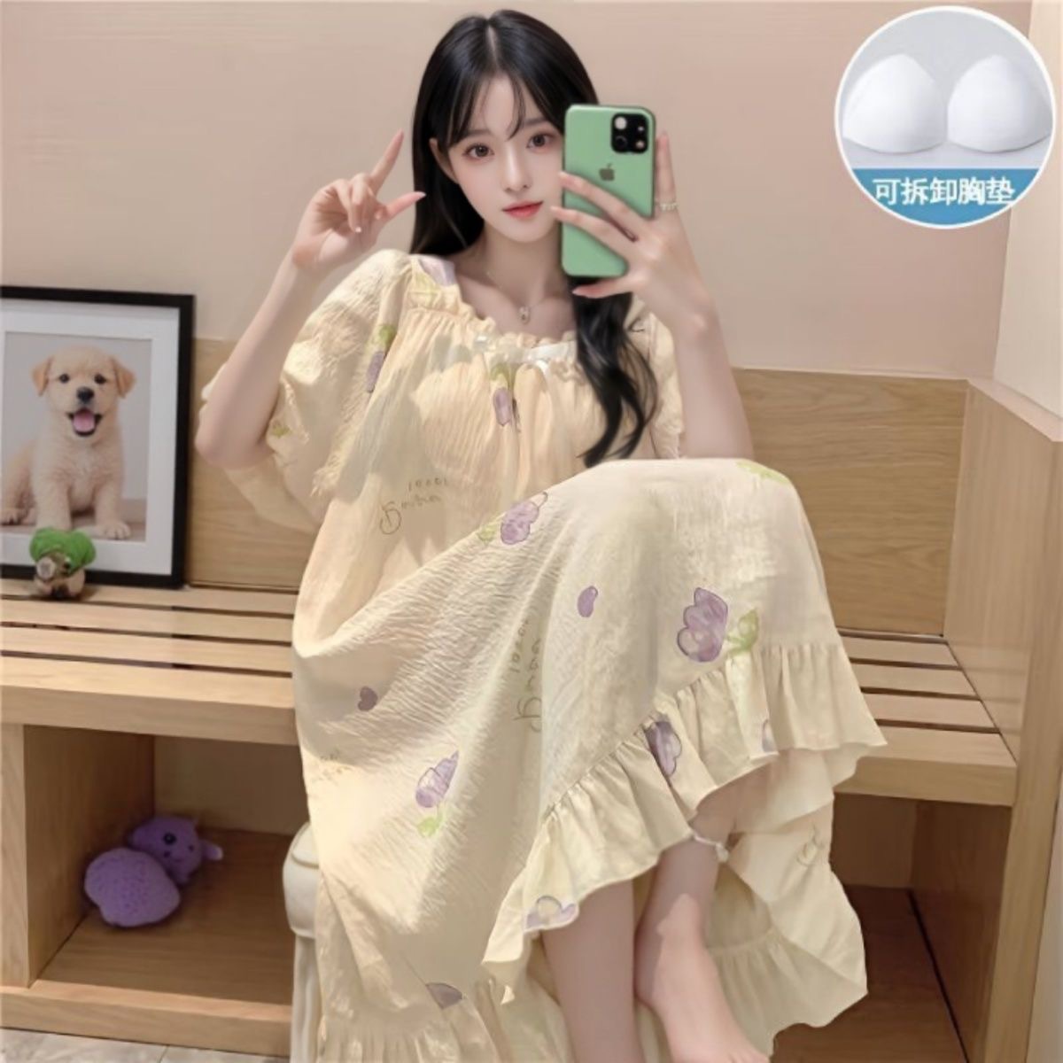 夏季新款云朵棉带胸垫睡衣女甜美公主风小飞袖睡裙宽松家居服夏天