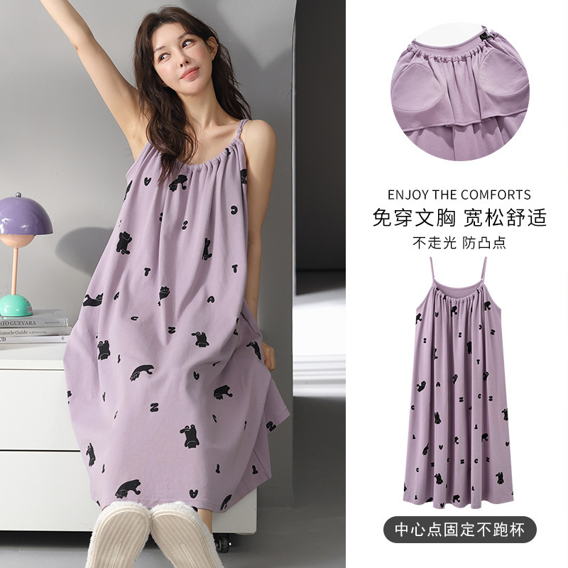 綿 100% サスペンダーパジャマ女性の夏の純粋な綿胸パッドホームウェアネグリジェ薄い紫色の猫ルーズ大きいサイズ