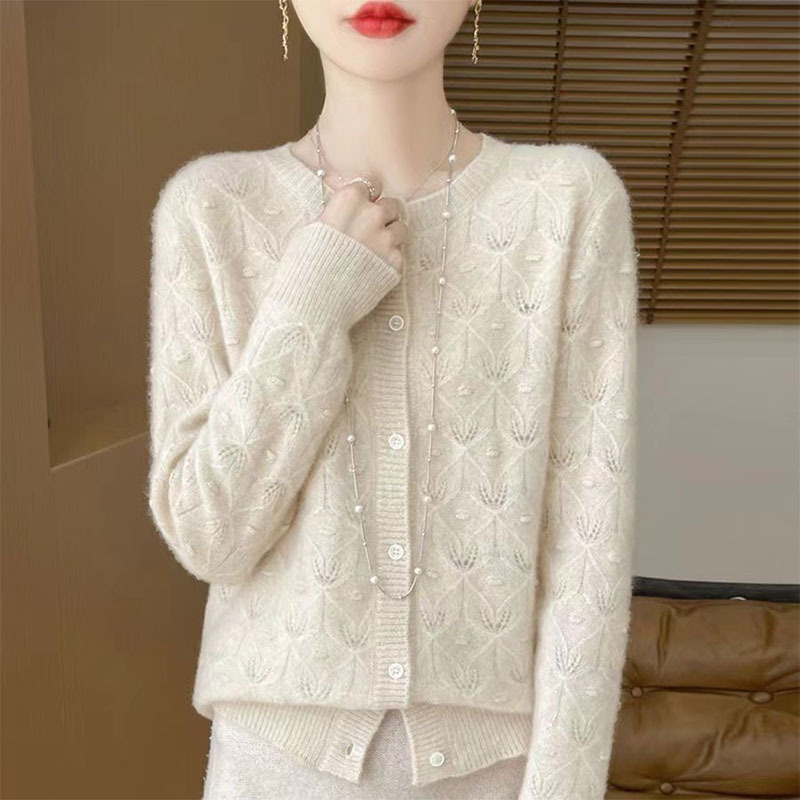 2025年 カーディガン レディース ラウンドネック 透かし編み ジャカード 長袖 ニットジャケット セーター ウール アウター エレガント