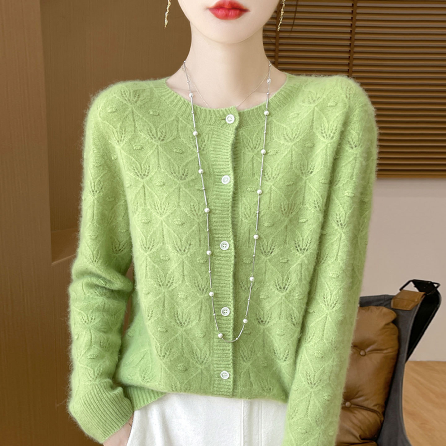 秋冬新款安迪绒纯色针织开衫 女圆领镂空提花 复古毛衣长袖针织衫