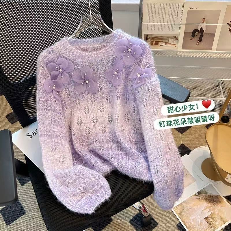 女性用グラデーションカラーセータージャケット、新しいデザインのビーズフラワーボトムシャツ、甘くて柔らかいワックス状セーター