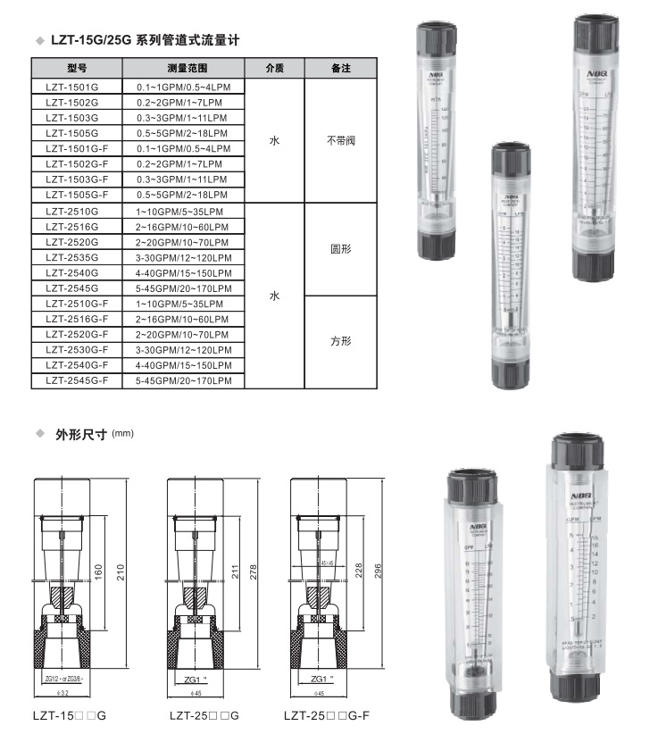 LZT-1501G(水0.1~1GPM/0.5~4LPM),LZT-1502G(水0.2~2GPM/1~7LPM),LZT-1503G(水0.3~3GPM/1~11LPM),LZT-1505G(水0.5~5GPM/2~18LPM),LZT-2510G(水1~10GPM/5~35LPM),LZT-2516G(水2~16GPM/10~60LPM),LZT-2520G(水2~20GPM/10~70LPM),LZT-2535G(水3-30GPM/12~120LPM),LZT-2540G(水4-40GPM/15~150LPM),LZT-2545G(水5-45GPM/20~170LPM),LZT-1501GB(水0.1~1GPM/0.5~4LPM),LZT-1502GB(水0.2~2GPM/1~7LPM),LZT-1503GB(水0.3~3GPM/1~11LPM),LZT-1505GB(水0.5~5GPM/2~18LPM),LZT-2510GB(水1~10GPM/5~35LPM),LZT-2516GB(水2~16GPM/10~60LPM),LZT-2520GB(水2~20GPM/10~70LPM),LZT-2535GB(水3-30GPM/12~120LPM),LZT-2540GB(水4-40GPM/15~150LPM),LZT-2545GB(水5-45GPM/20~170LPM),LZT-1501GBK(水0.1~1GPM/0.5~4LPM),LZT-1502GBK(水0.2~2GPM/1~7LPM),LZT-1503GBK(水0.3~3GPM/1~11LPM),LZT-1505GBK(水0.5~5GPM/2~18LPM),LZT-2510GBK(水1~10GPM/5~35LPM),LZT-2516GBK(水2~16GPM/10~60LPM),LZT-2520GBK(水2~20GPM/10~70LPM),LZT-2535GBK(水3-30GPM/12~120LPM),LZT-2540GBK(水4-40GPM/15~150LPM),LZT-2545GBK(水5-45GPM/20~170LPM)