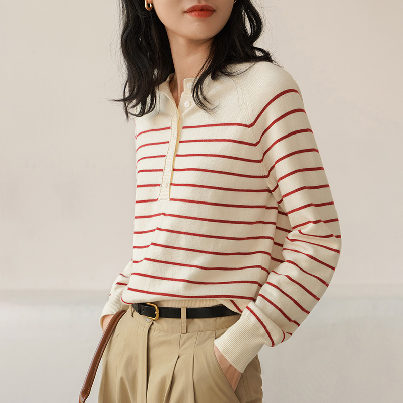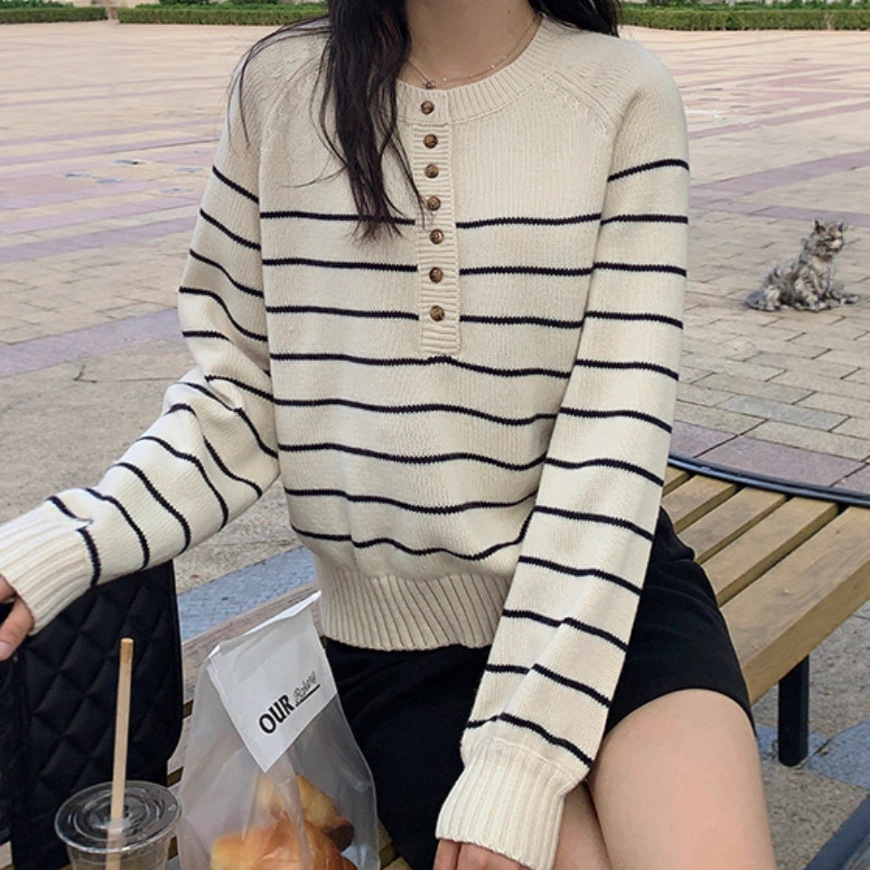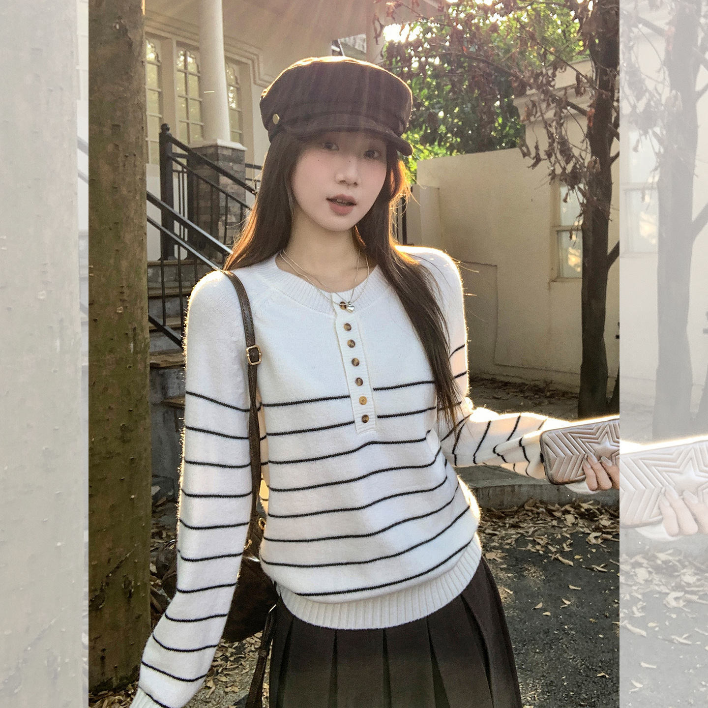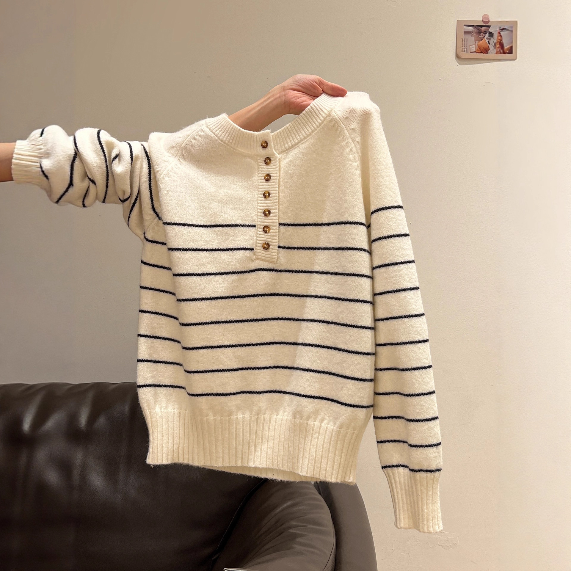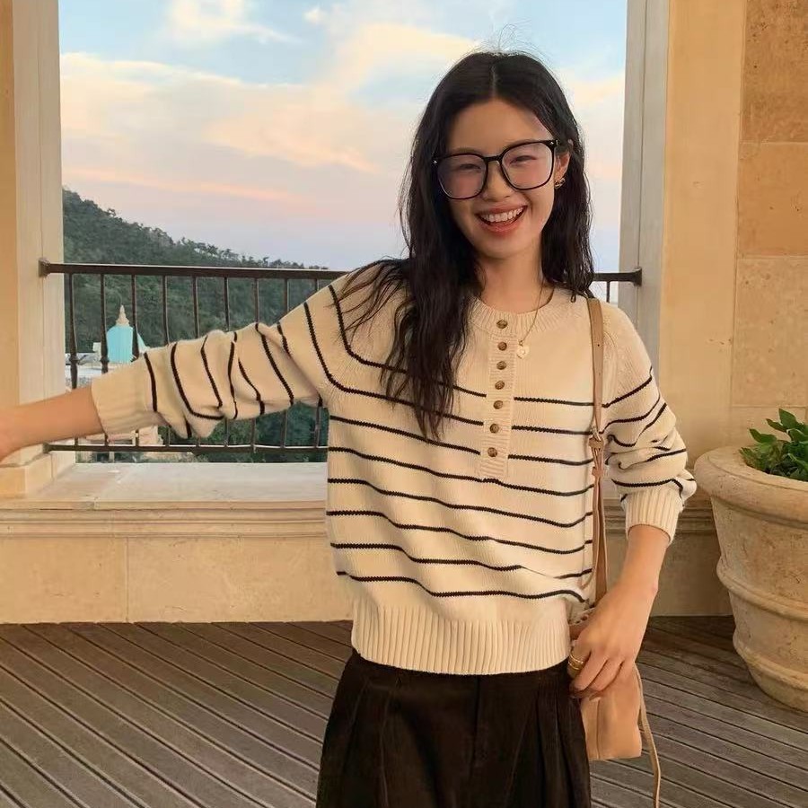秋冬の女性用フレンチストライプセーター、レイジースタイルのレトロなソフトでワックスのようなルーズ長袖ボトムストップ