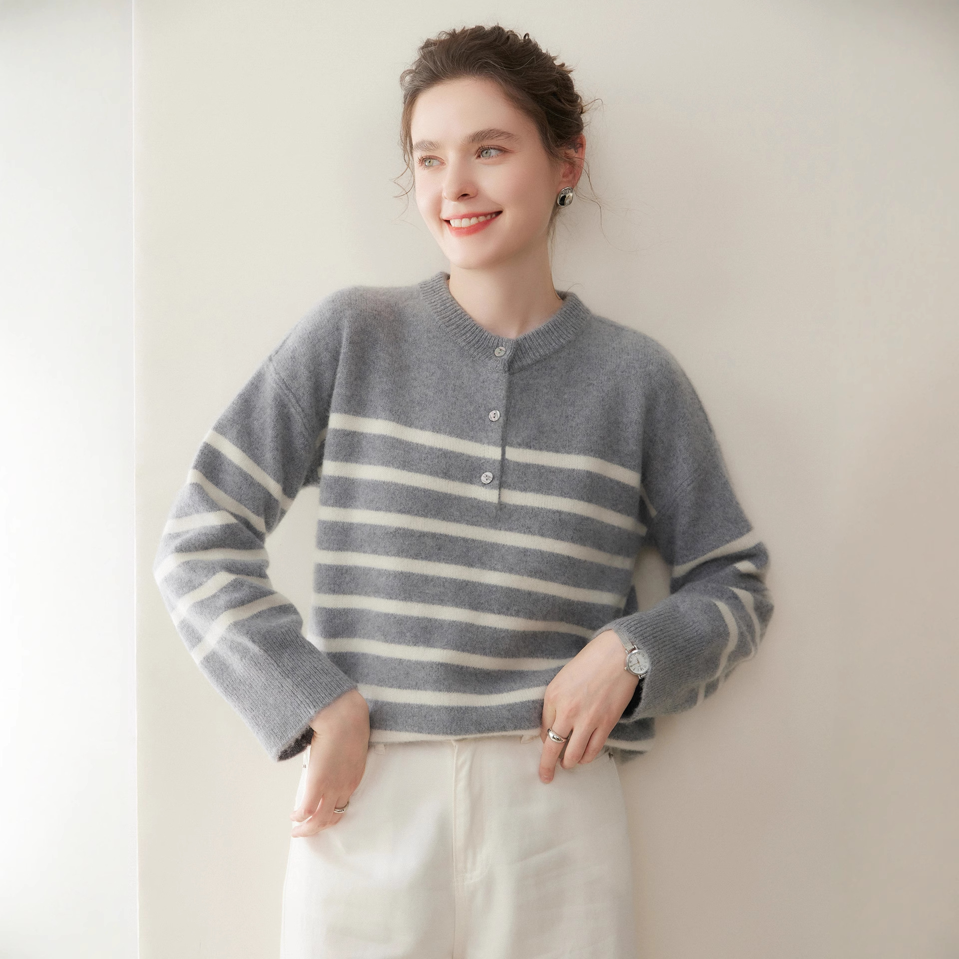 暮色微风条纹毛衣女秋冬小众温柔舒适圆领显瘦休闲羊毛针织衫上衣