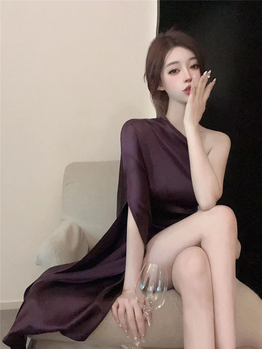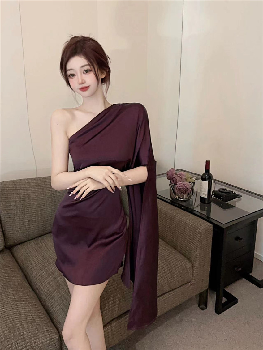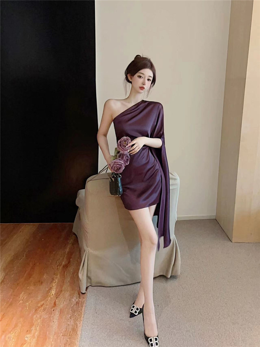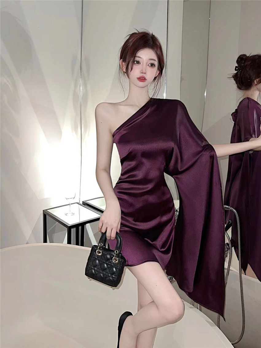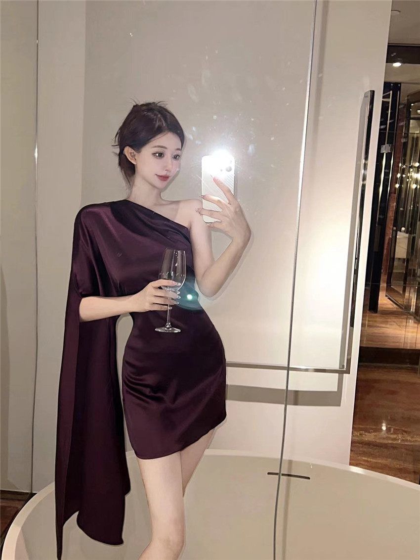 セレブ風デザインオフショルダーシルクドレスフレンチウエストスリムフィットバンケットドレスナイトクラブショートドレス