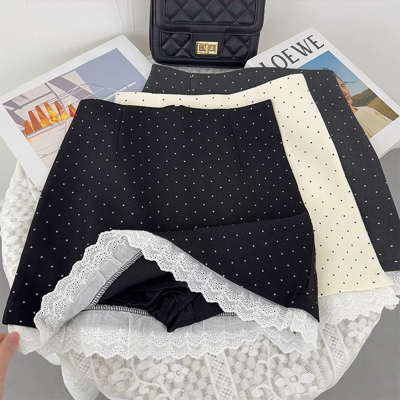 法式木耳边蕾丝拼接波点西装半身裙女2025秋季高腰A字防走光短裙