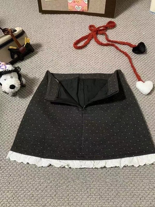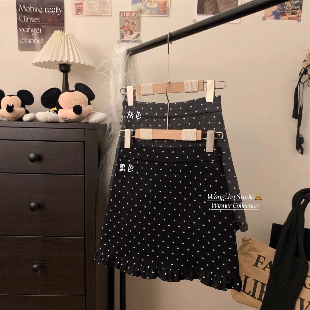 设计感木耳边波点毛呢半身裙女冬季2025新款显瘦高腰包臀A字短裙