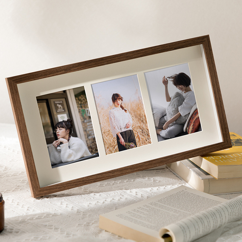 中空フォトフレームの連体三連の舞台の写真フレームのウェディングドレスの子供の成長のキャンパスの記念フレームは壁の木製の立体を掛けます。