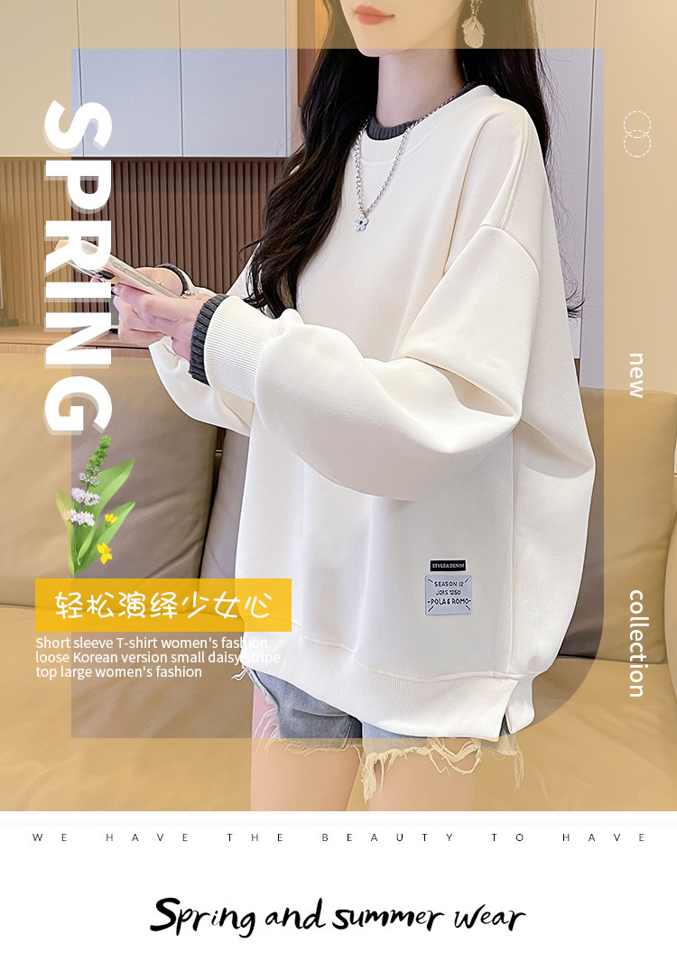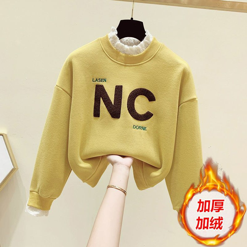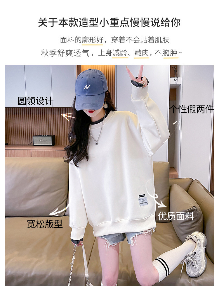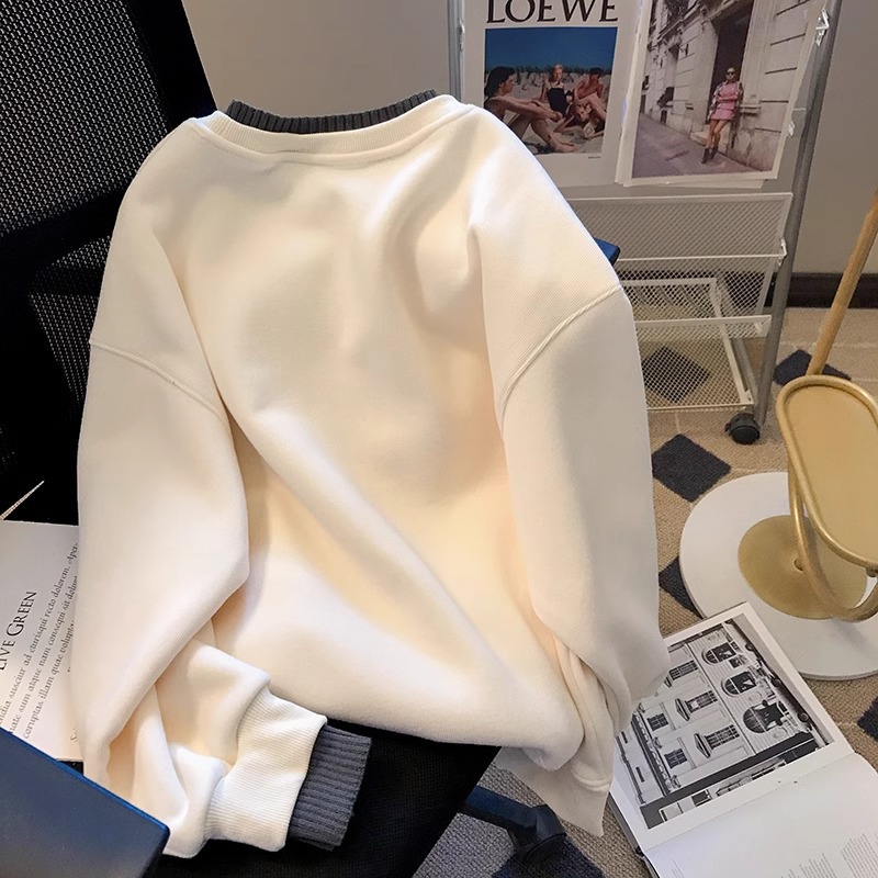 新しい秋と冬のベルベットの厚みのある女性用スウェットシャツ、韓国スタイルのプルオーバー、レイジースタイルのラウンドネック、女性用のルーズなフェイクツーピーストップス