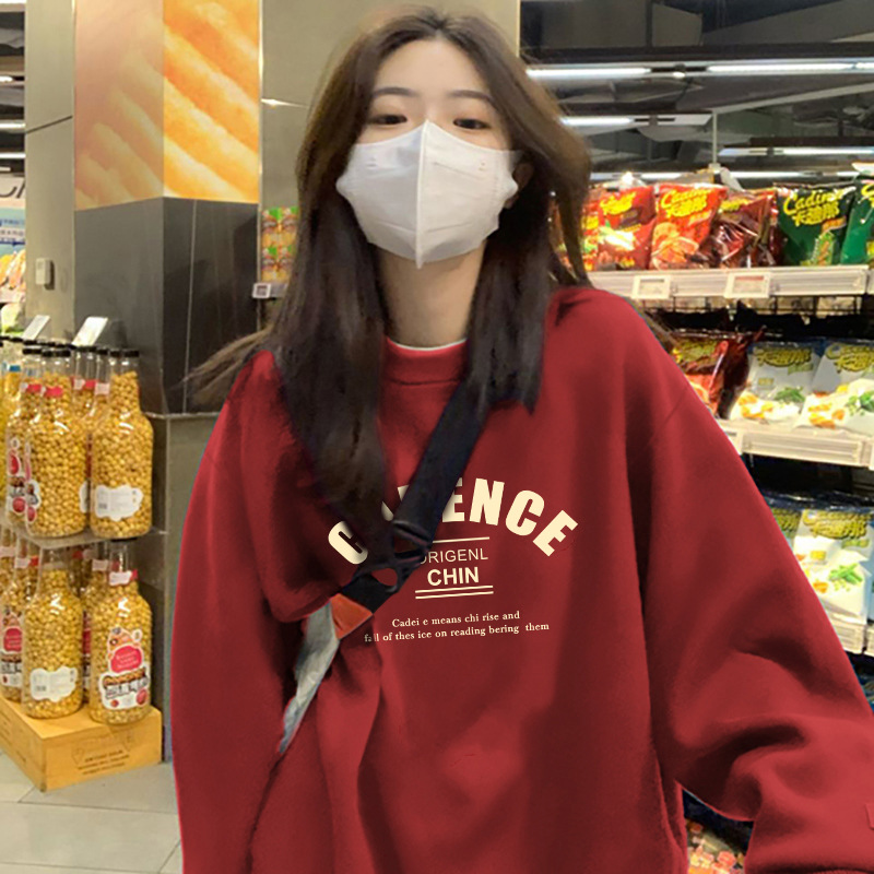 本命年枣红色圆领卫衣女春秋款2025新款欧货大版宽松加绒厚外套冬