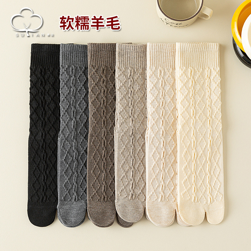 二指分趾袜子女中筒袜ins潮羊毛菱格女袜冬薄绒保暖猪蹄鞋羊蹄袜