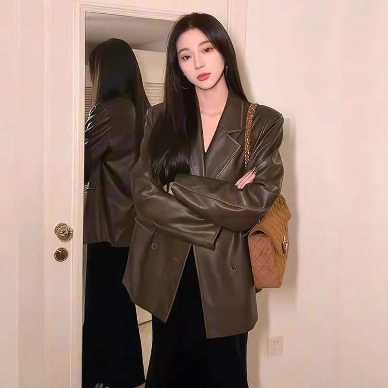 ブラウン気質レザージャケット女性のための 2025 新しい韓国スタイルルーズレトロカジュアル香港スタイルオートバイ pu ジャケットトレンディ