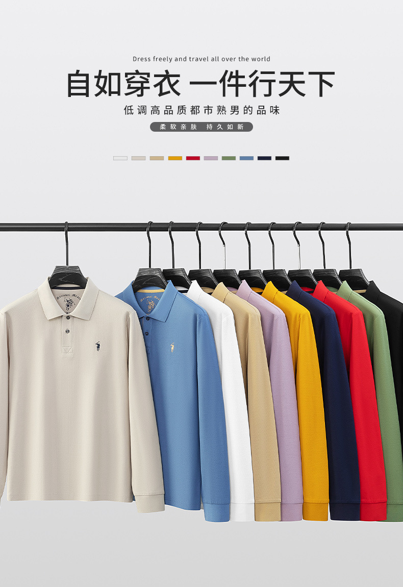 100%纯棉男装长袖polo衫春秋季高端双刺马标绣潮牌体恤商务t恤男
